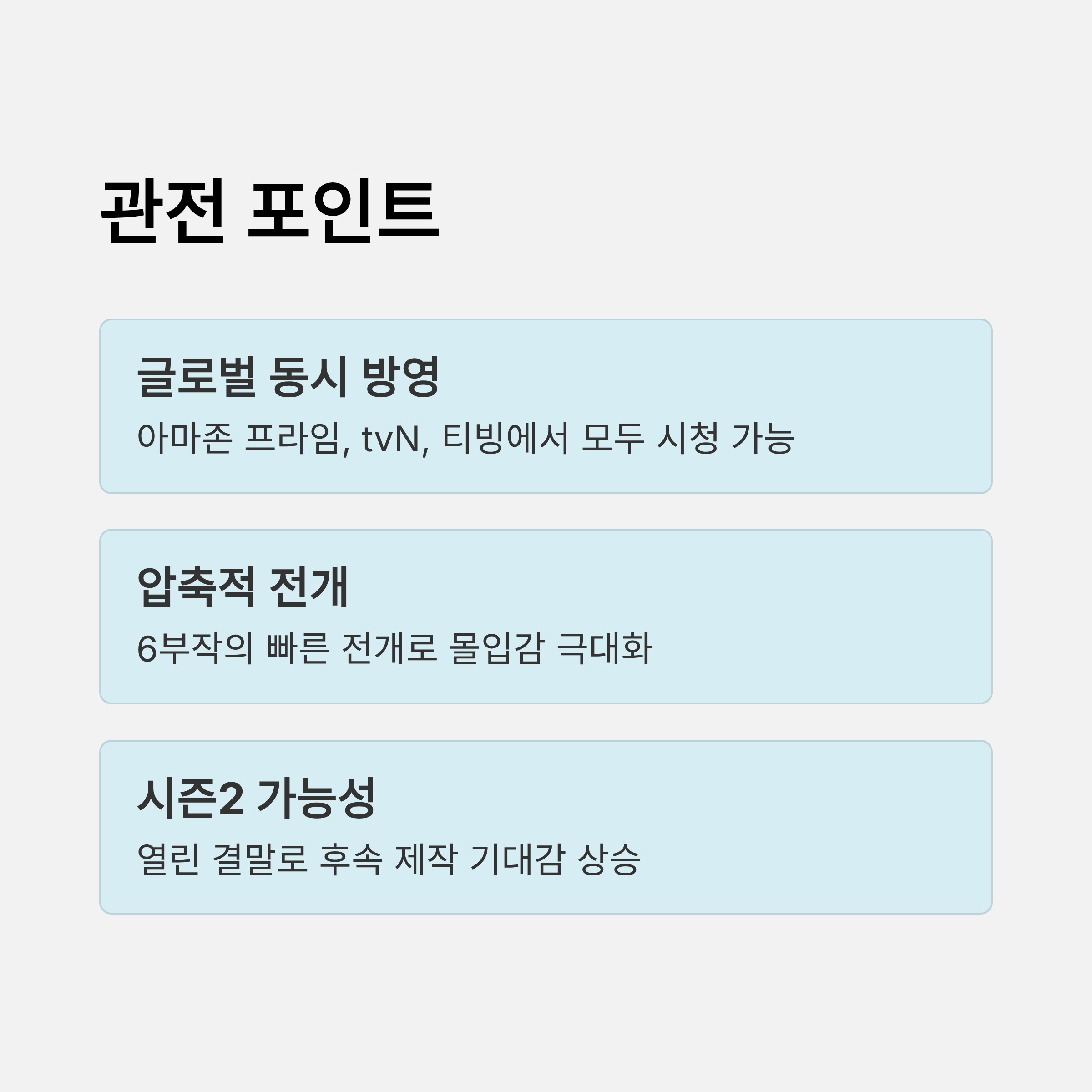 - 글로벌 OTT 동시 방영 – 아마존 프라임, tvN, 티빙에서 모두 시청 가능