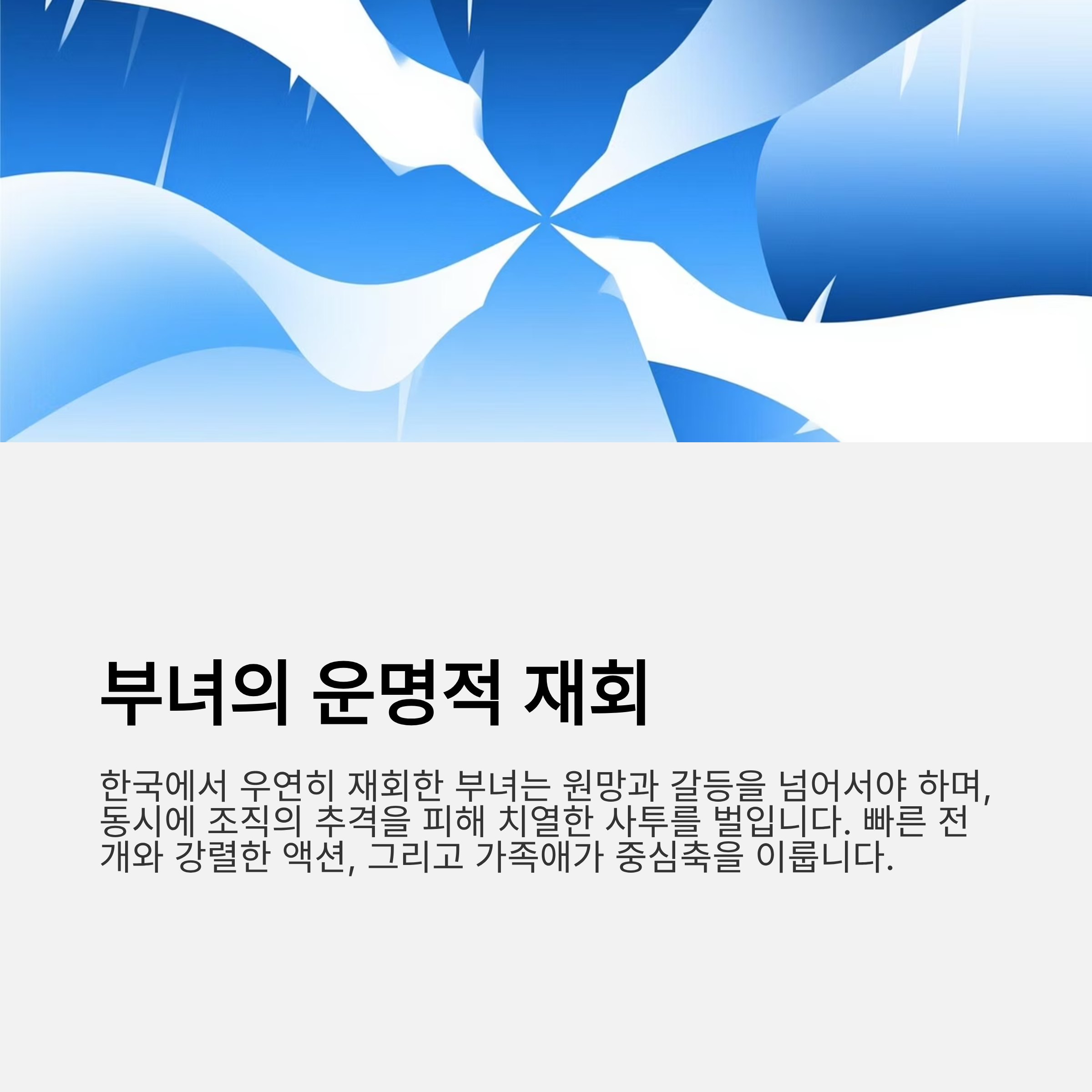 운명처럼 한국에서 재회한 부녀는 원망과 갈등을 넘어서야 하며, 동시에 조직의 추격을 피해 치열한 사투를 벌입니다. 빠른 전개와 강렬한 액션, 그리고 가족애가 중심축을 이루며, 마지막 회에서는 조직의 배후와 시즌2 가능성을 암시하는 결말이 준비되어 있습니다.