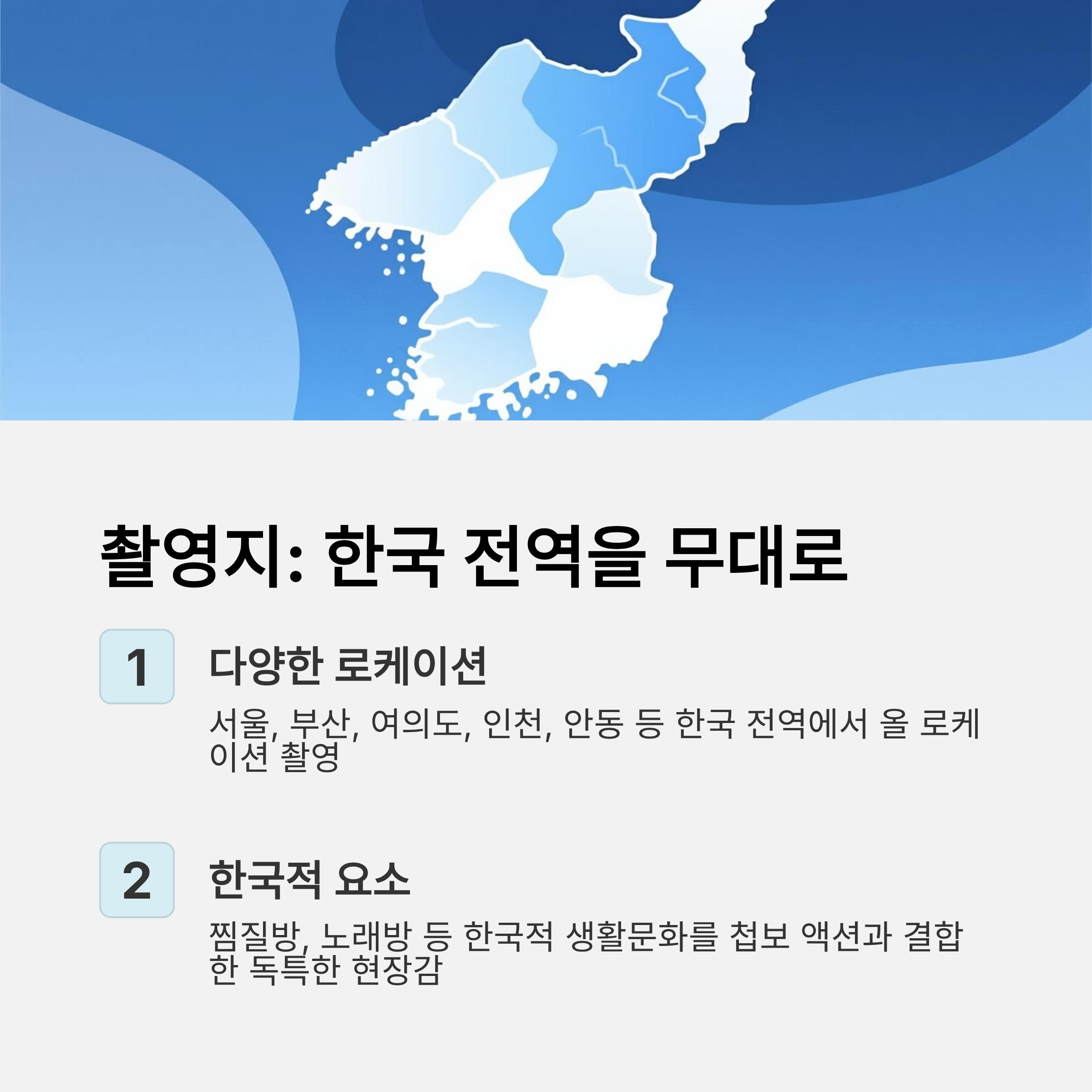 - 한국 전역 로케이션 – 익숙한 공간에서 벌어지는 첩보전으로 이색적인 재미 제공
