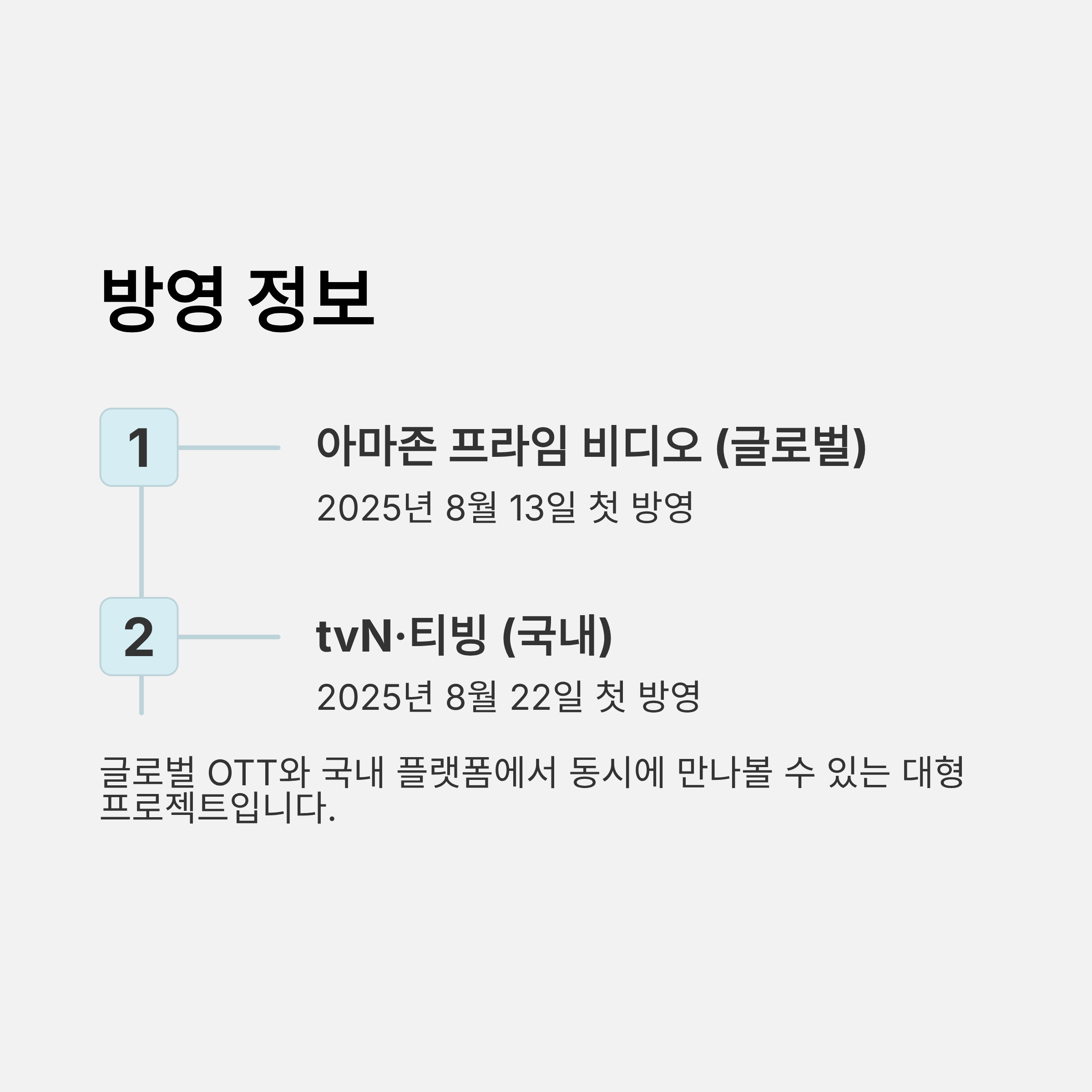 - 방송 플랫폼: 아마존 프라임 비디오(글로벌) / tvN·티빙(국내)