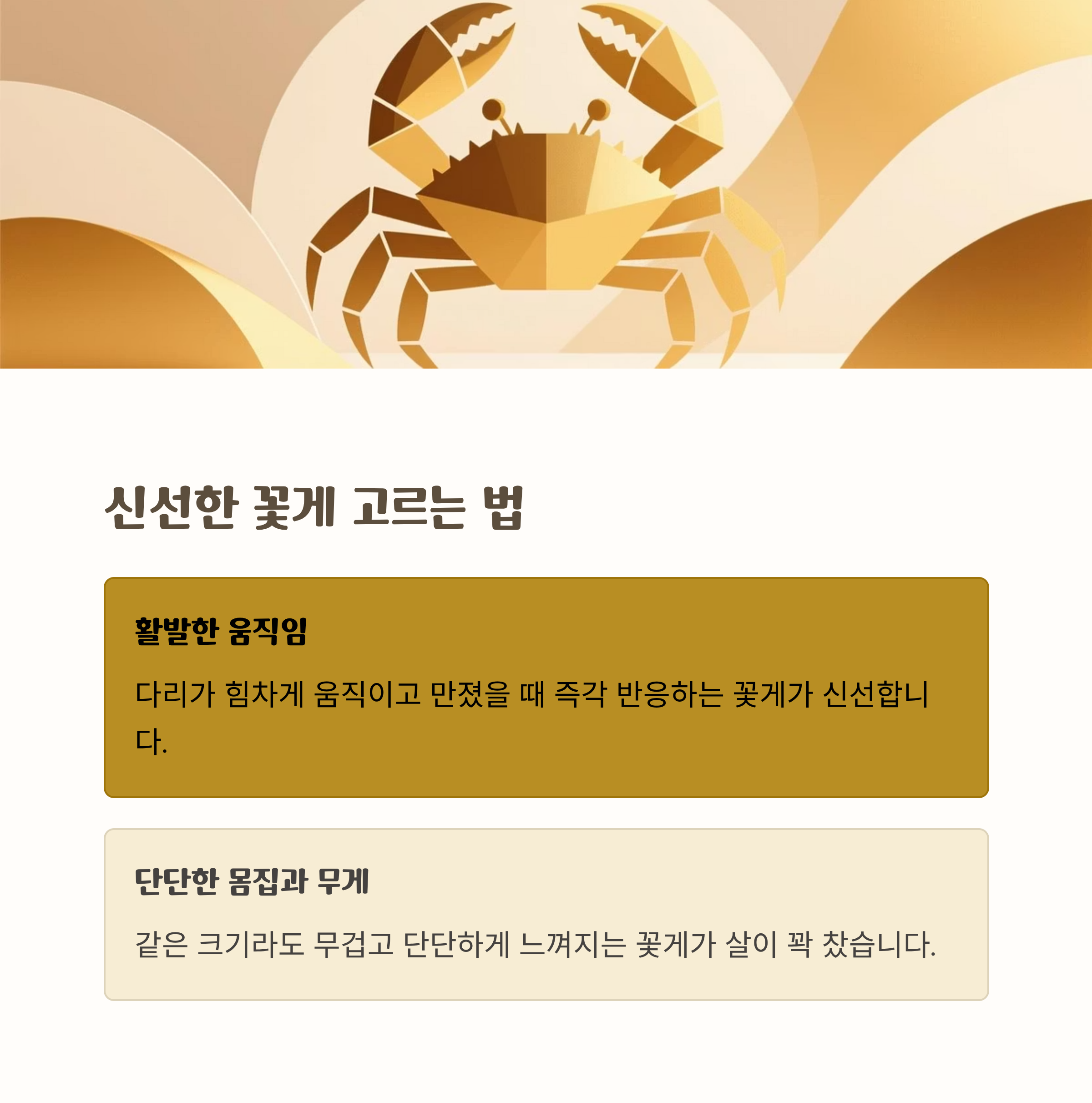 - 움직임: 살아있는 꽃게는 다리와 집게가 활발하게 움직여야 합니다.