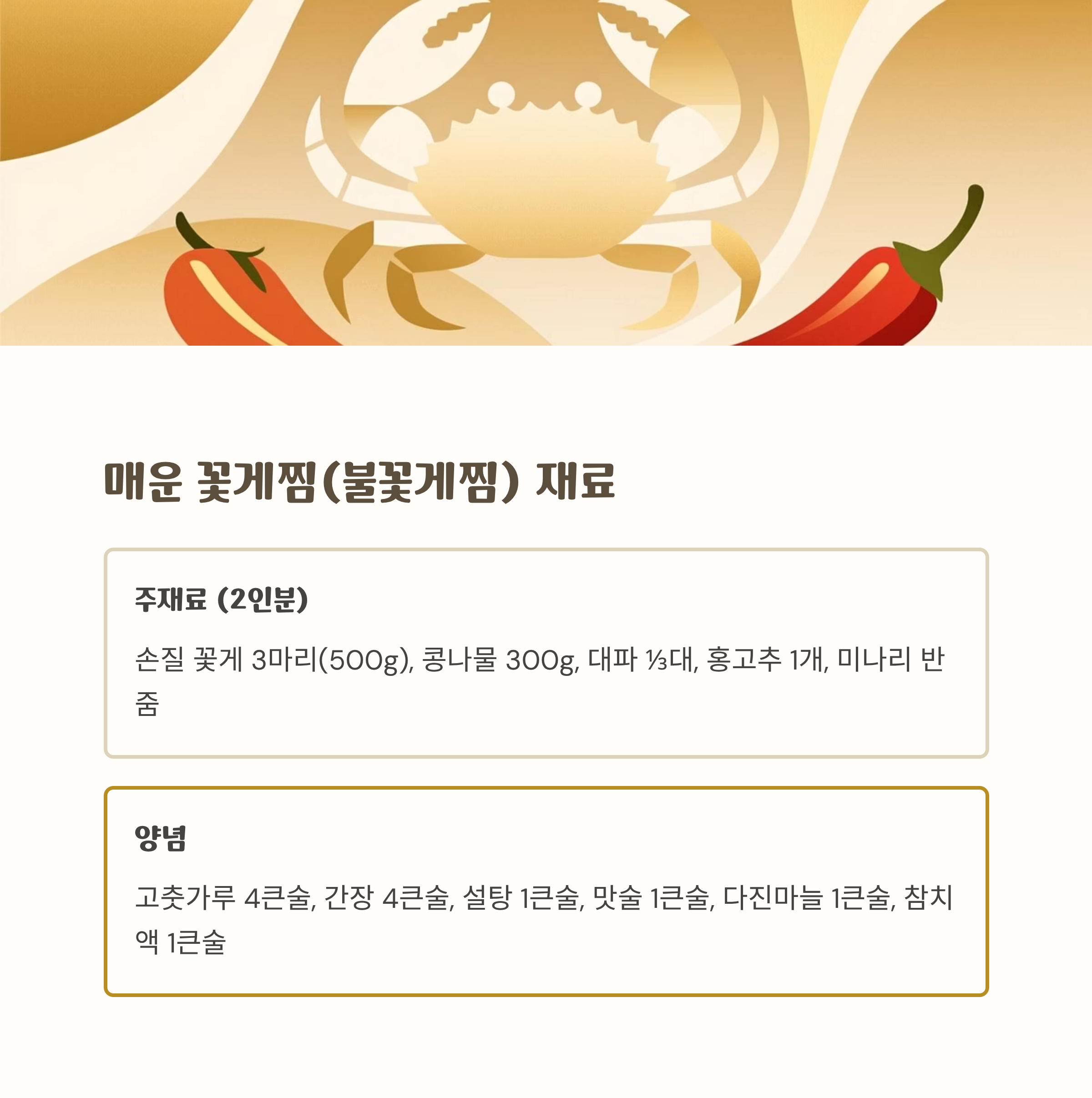 - 완성 후 참기름 약간을 두르면 매운 꽃게찜 완성.