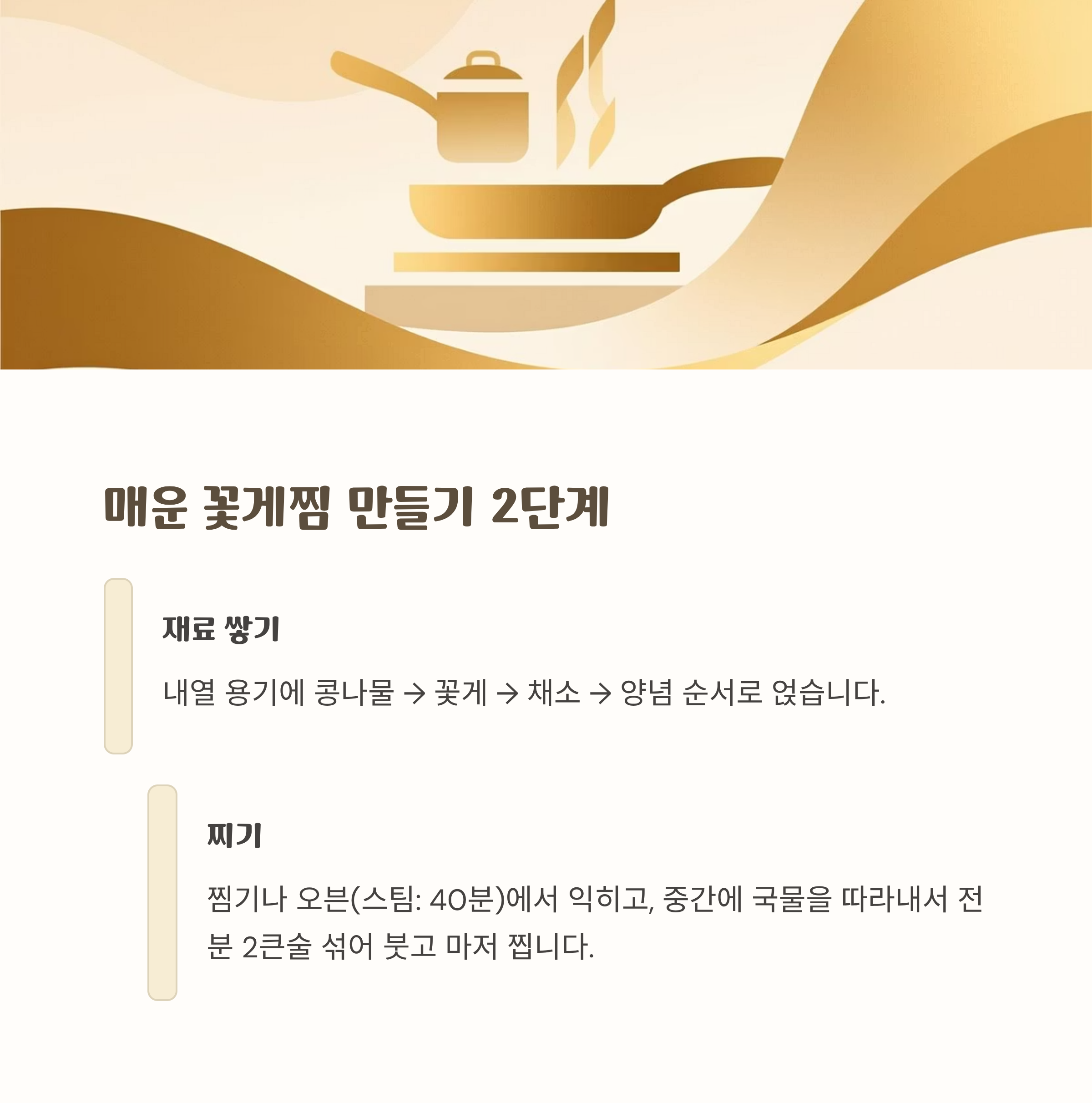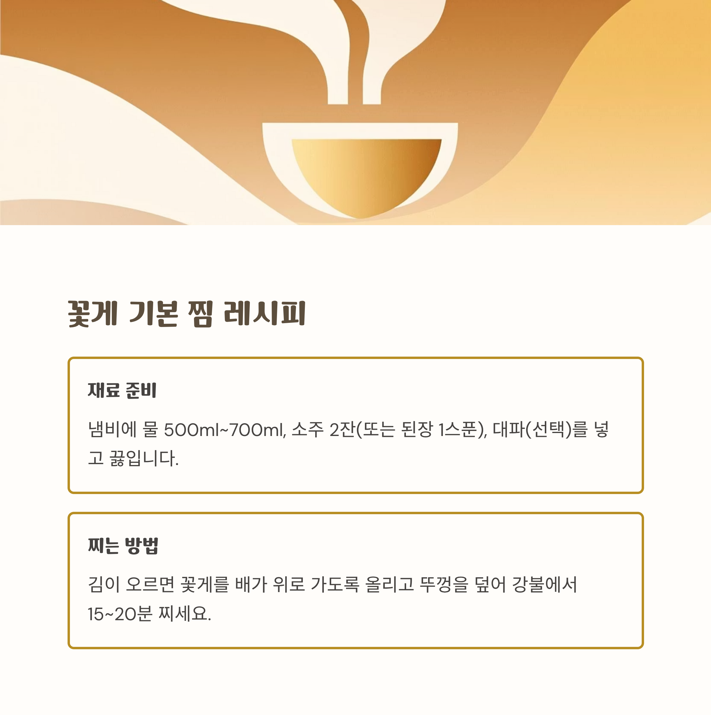👉 팁: 찌는 도중 뚜껑을 열지 마세요. 소주·된장은 비린내 제거와 감칠맛 향상에 효과적입니다.