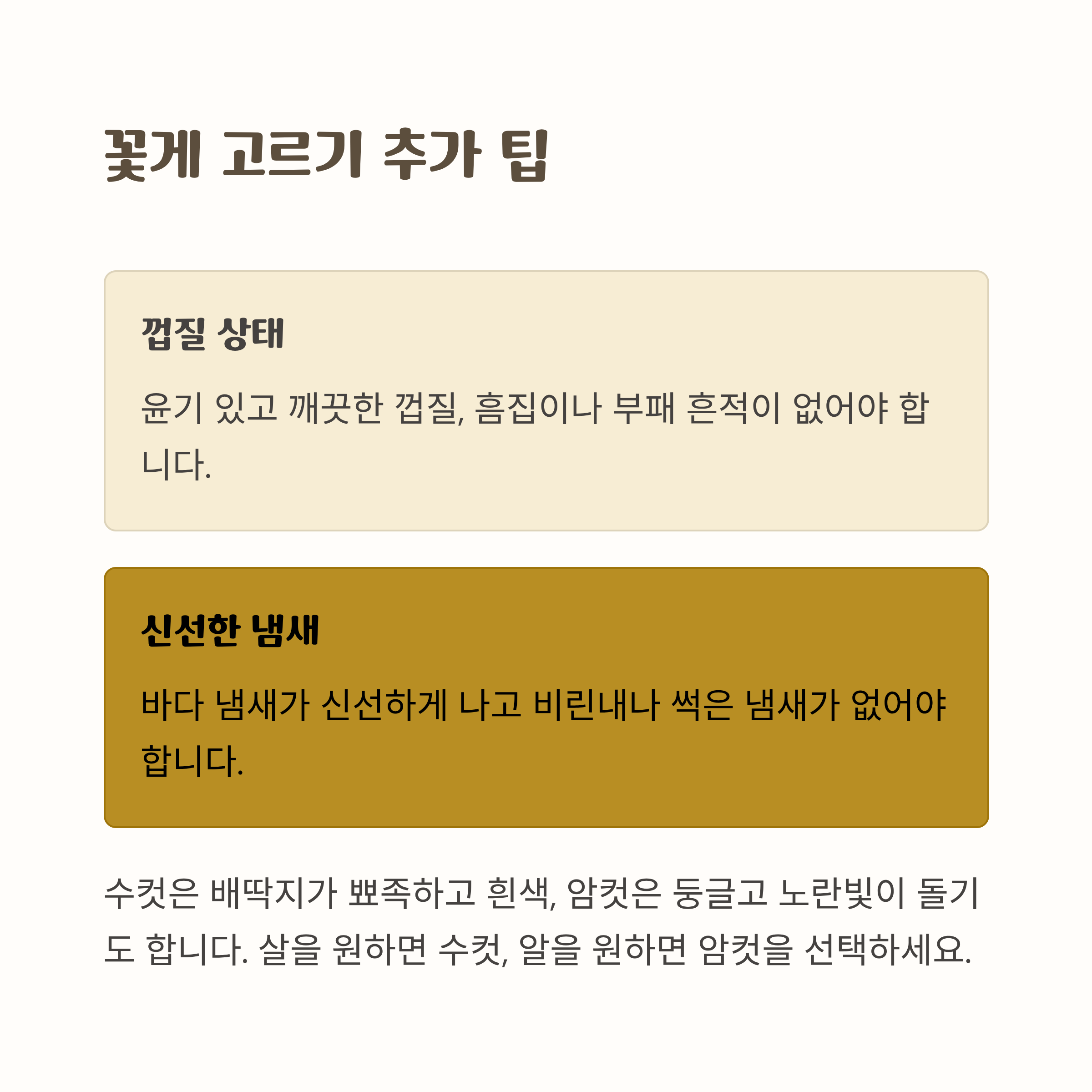 - 껍질 상태: 윤기 있고 단단해야 하며, 흠집이나 곰팡이 흔적이 없어야 합니다.
