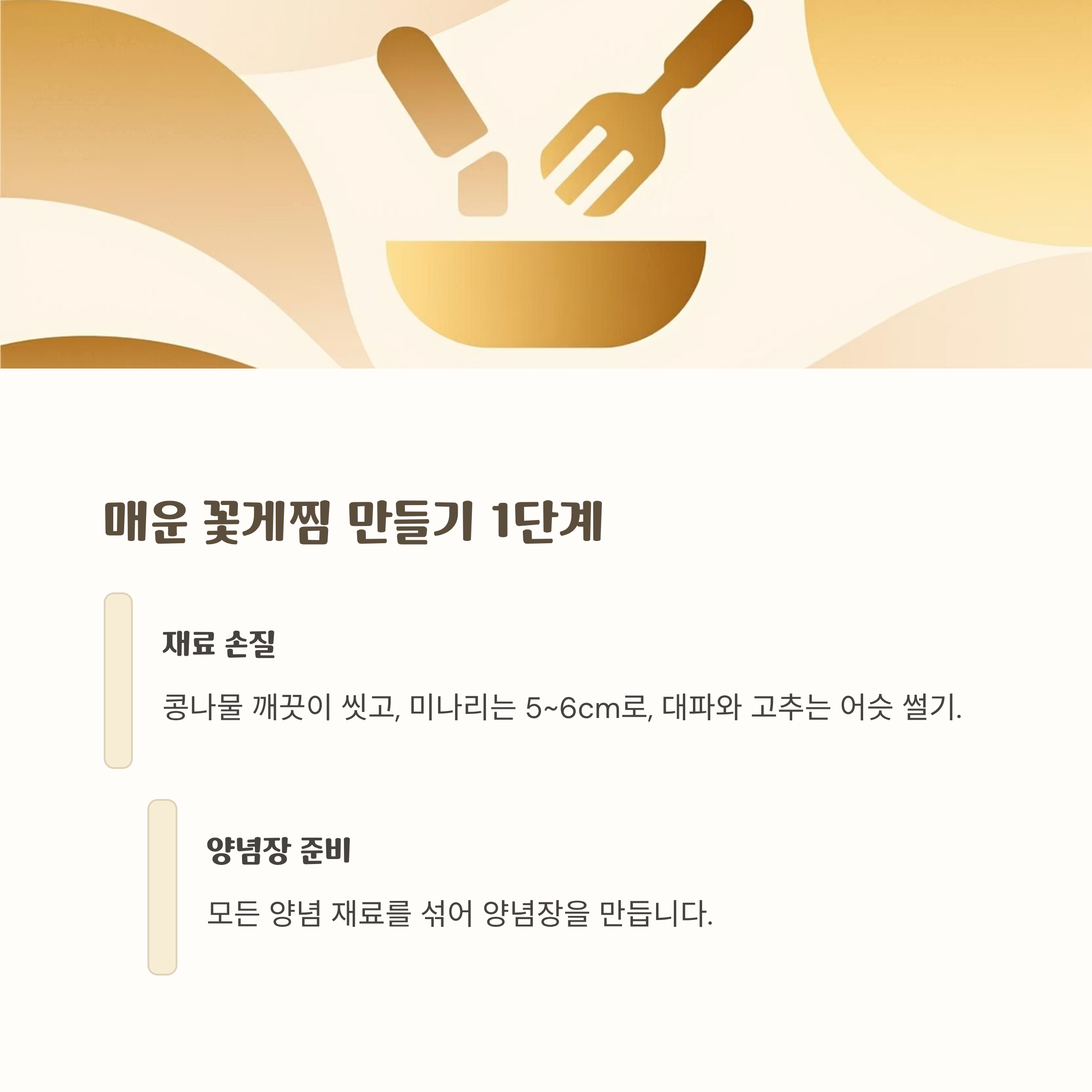 - 채소 손질 (콩나물 씻기, 미나리 5~6cm 자르기, 대파·고추 어슷썰기).