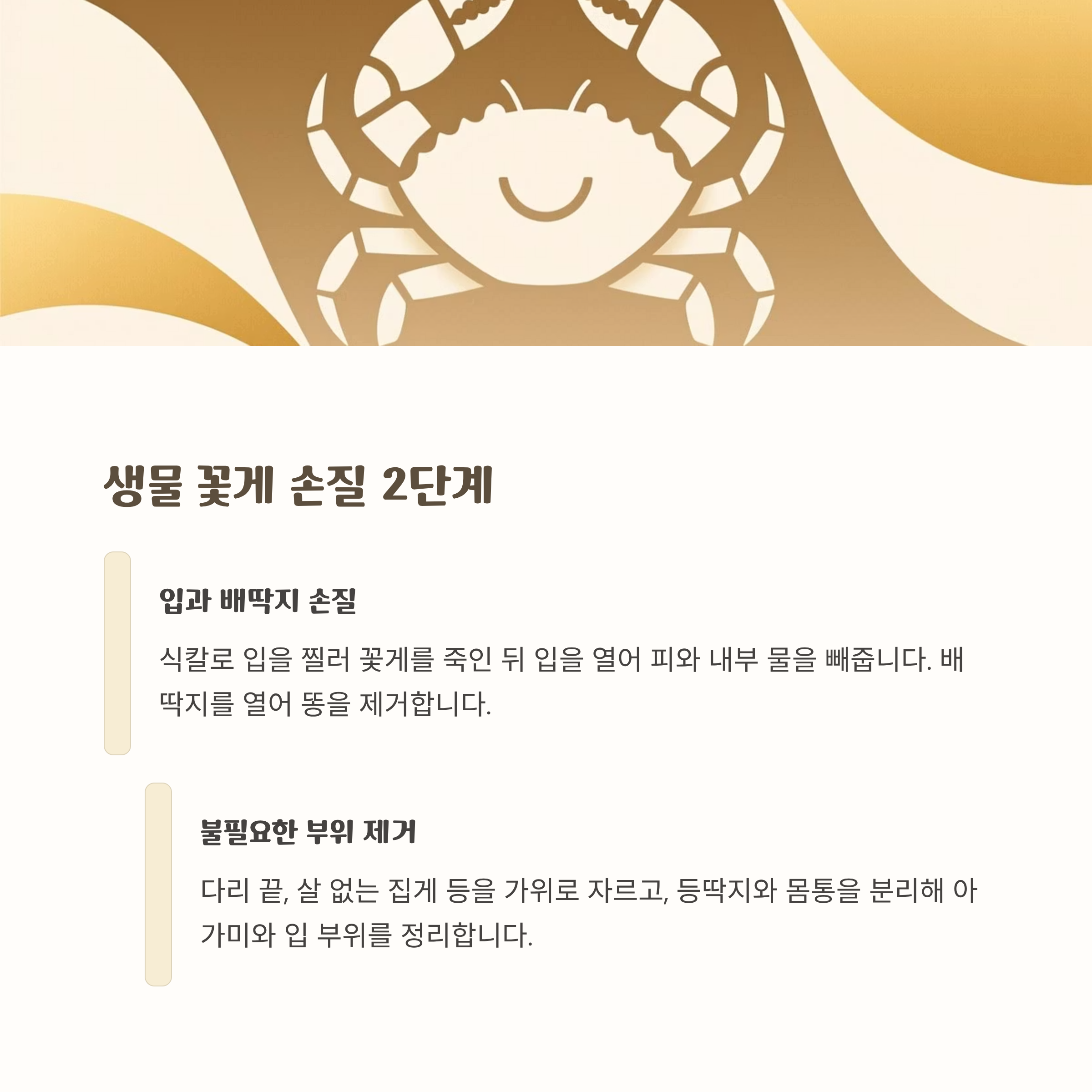 - 배딱지를 떼고, 등딱지·아가미·입 부위를 정리한 후 반으로 잘라 완성합니다.