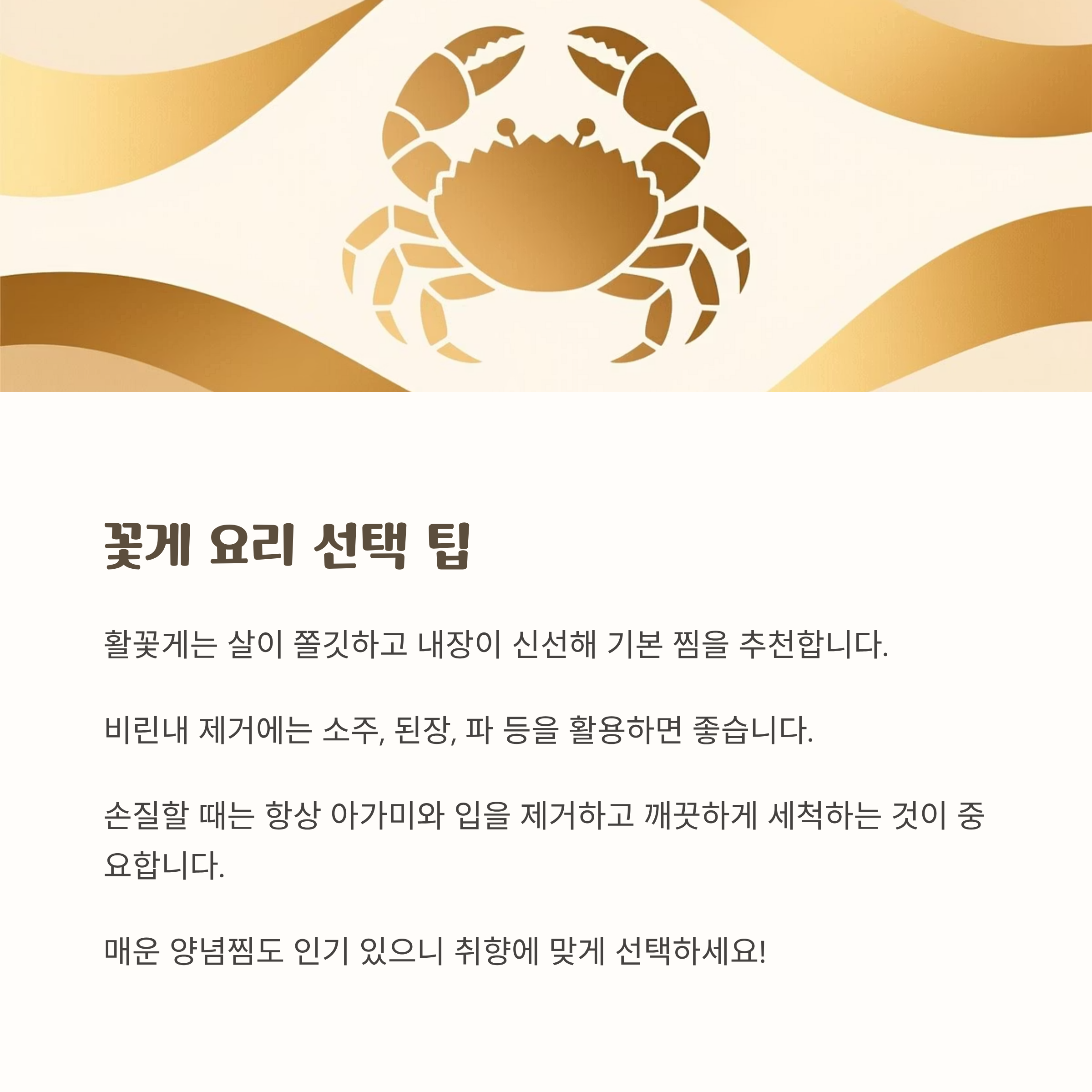 - 냄새: 비린내보다는 신선한 바다 향이 나는 꽃게를 고릅니다.