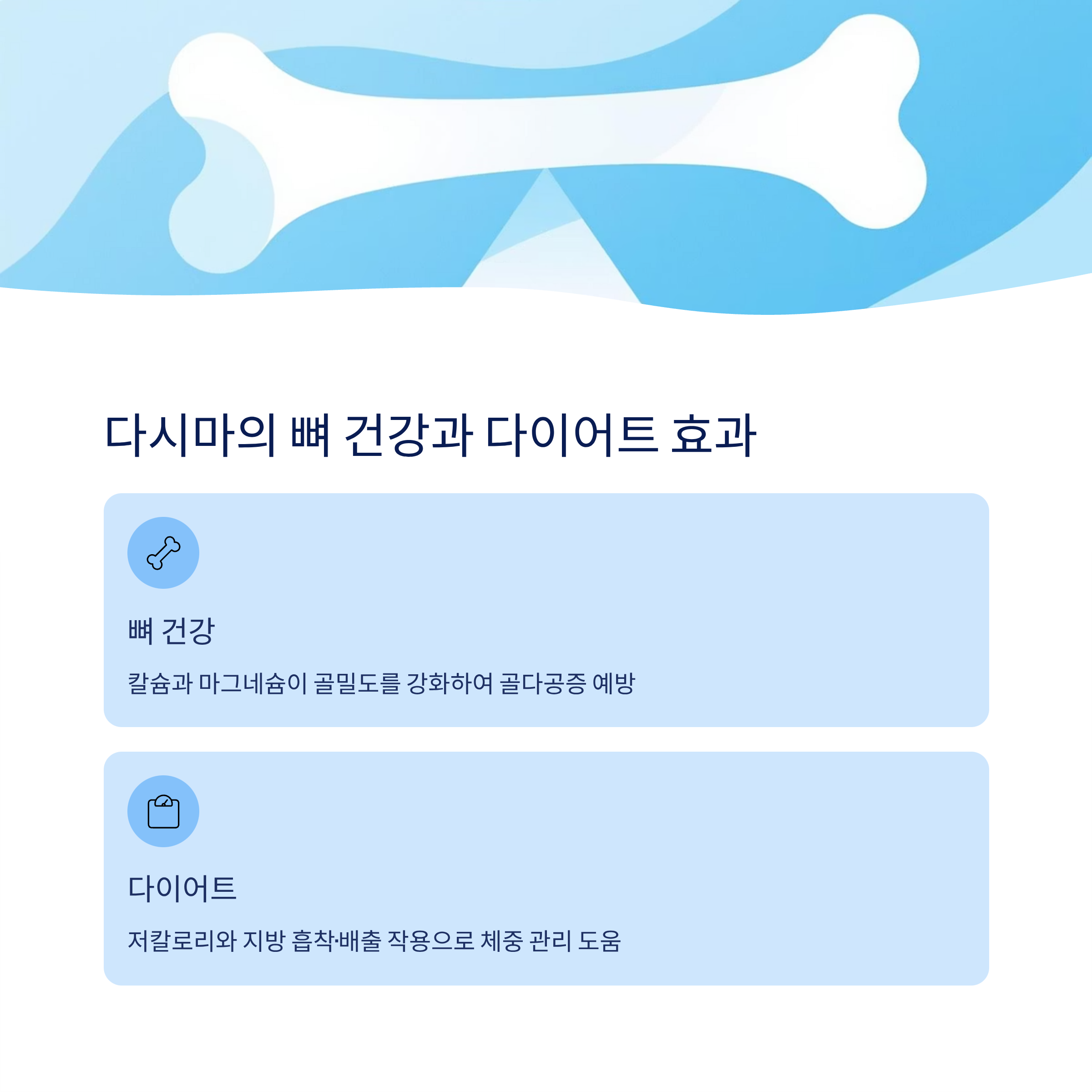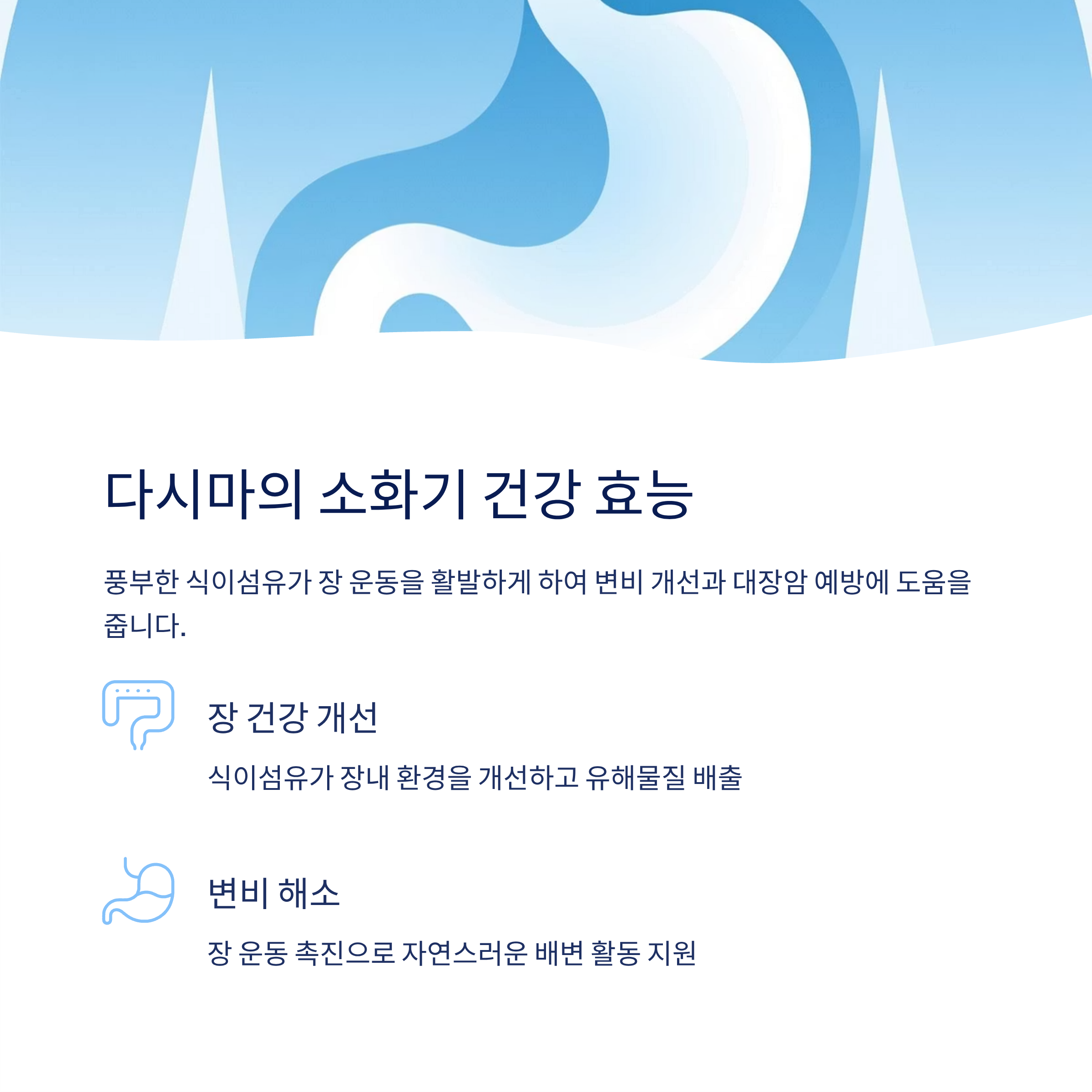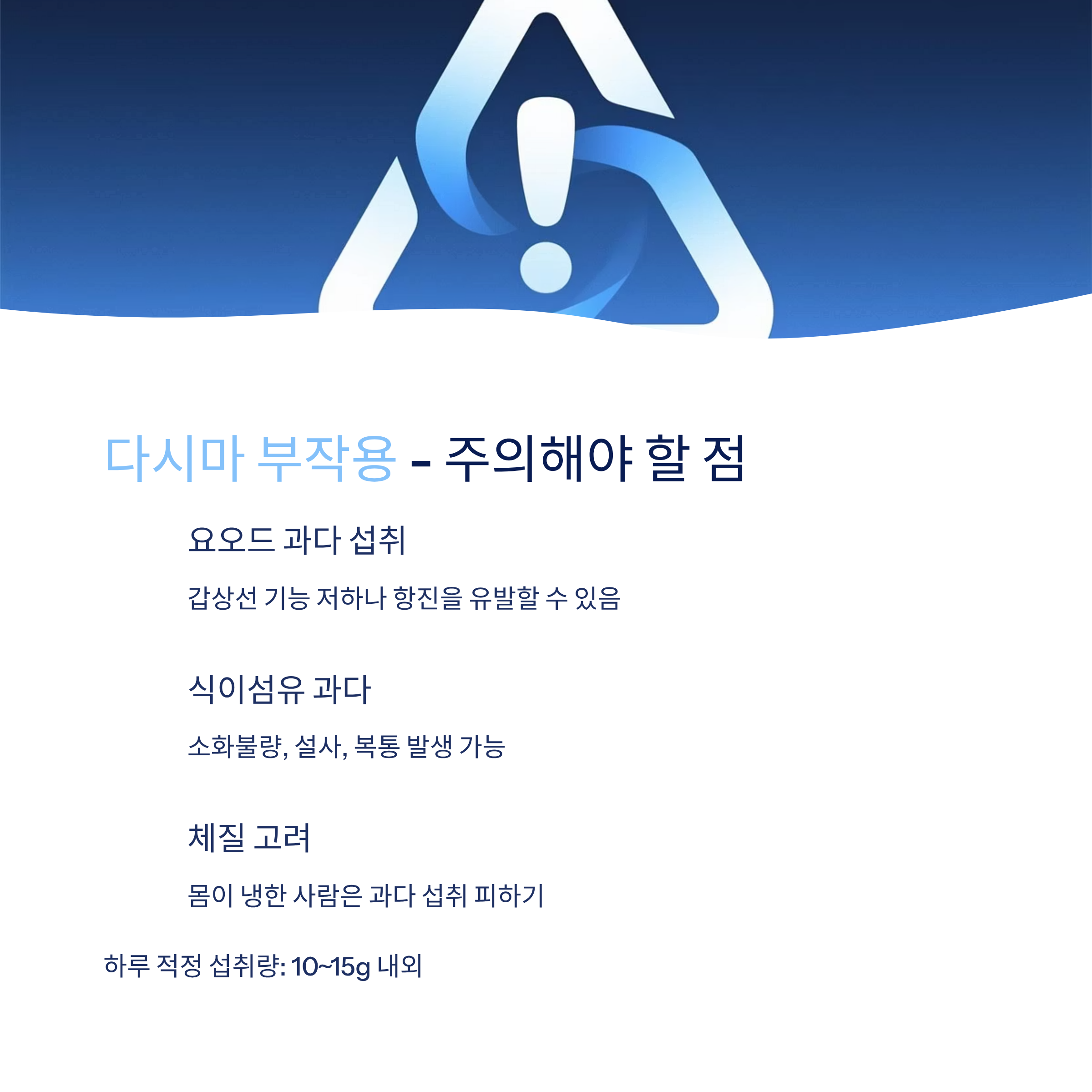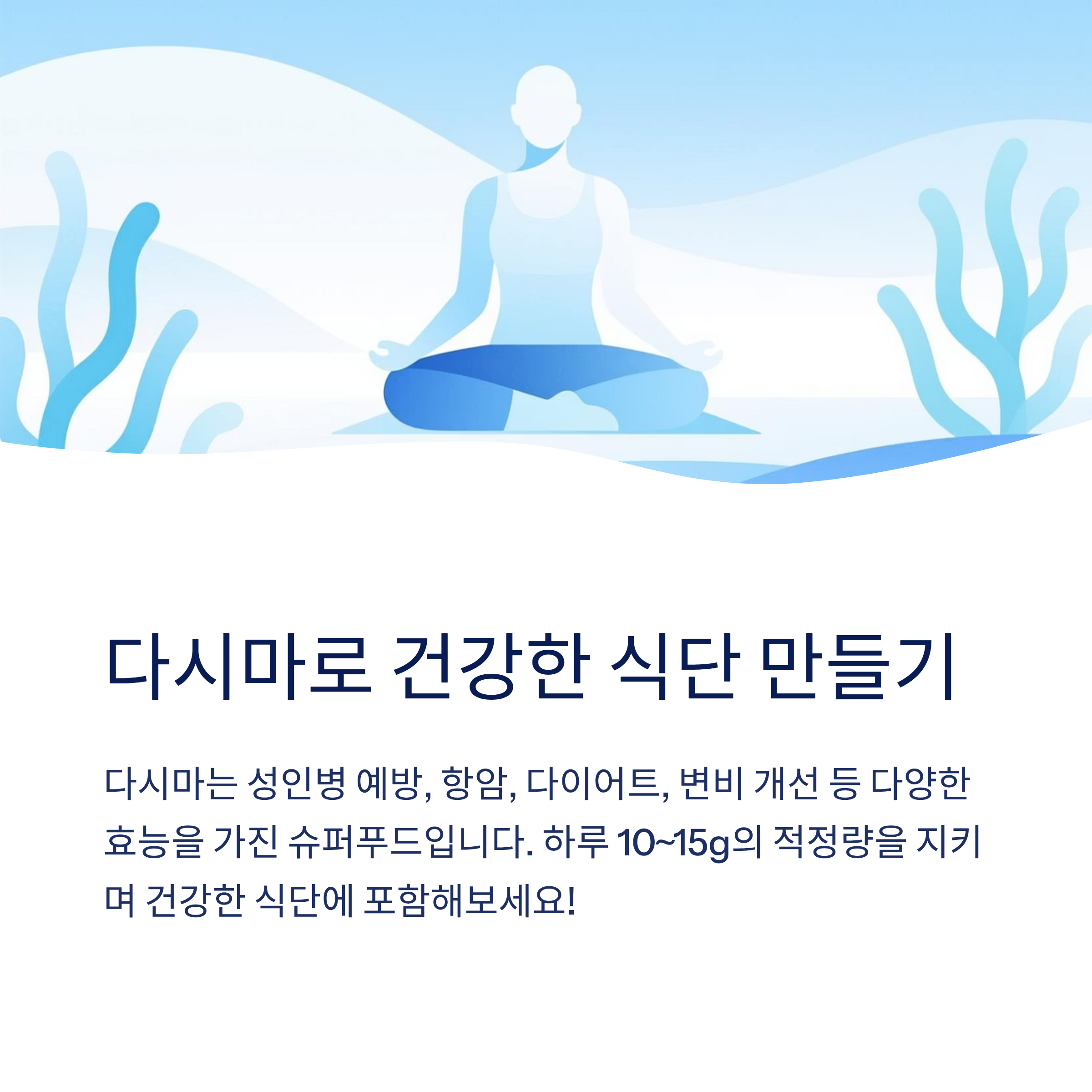 다시마는 성인병 예방, 항암, 다이어트, 변비 개선, 뼈 건강, 모발 건강 등 다양한 효능을 가진 슈퍼푸드입니다. 하지만 과다 섭취 시 요오드 과잉, 소화불량, 갑상선·신장 문제로 이어질 수 있으므로 반드시 적정량을 지켜야 합니다.