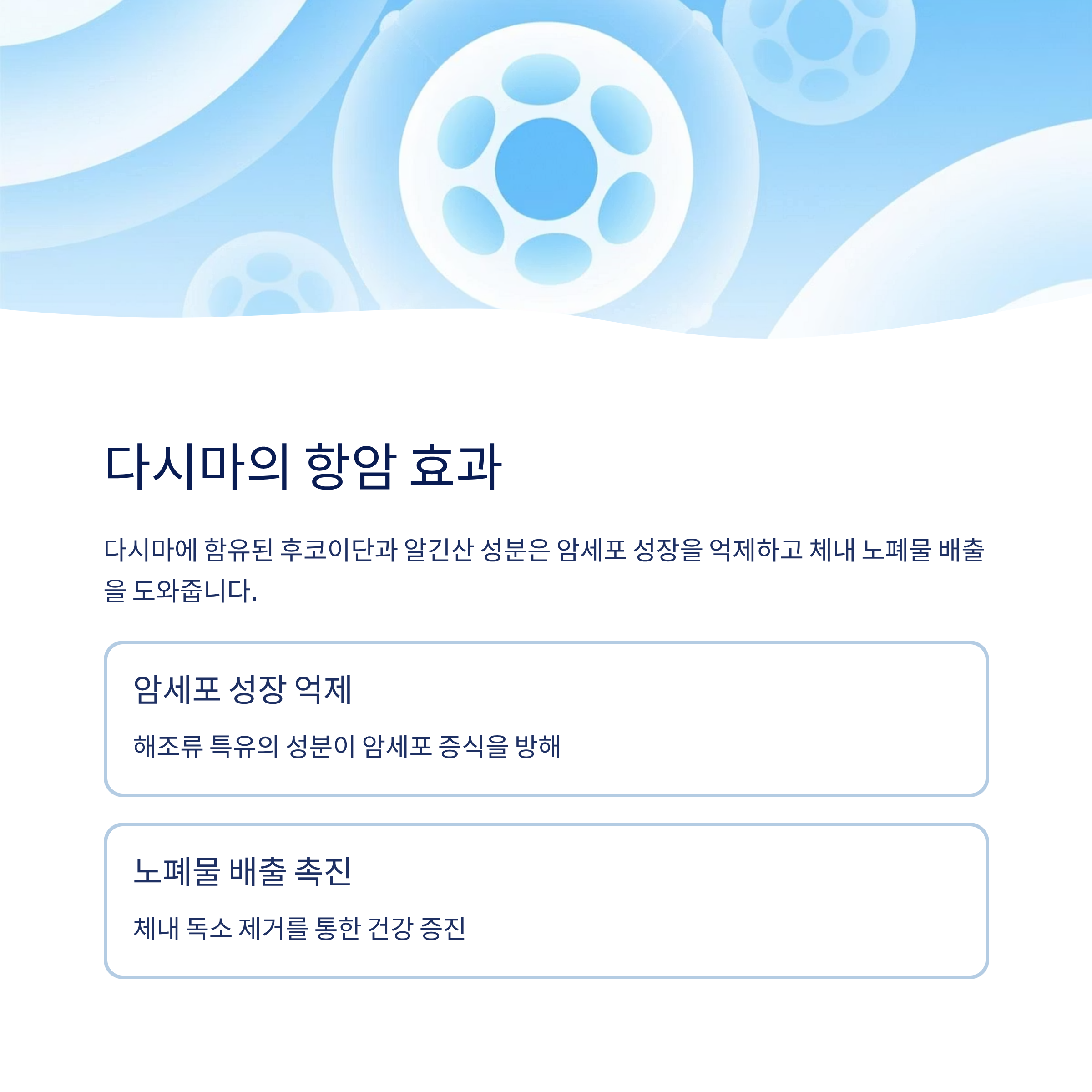 - 후코이단·알긴산 성분이 암세포 성장 억제 및 노폐물 배출을 돕습니다.