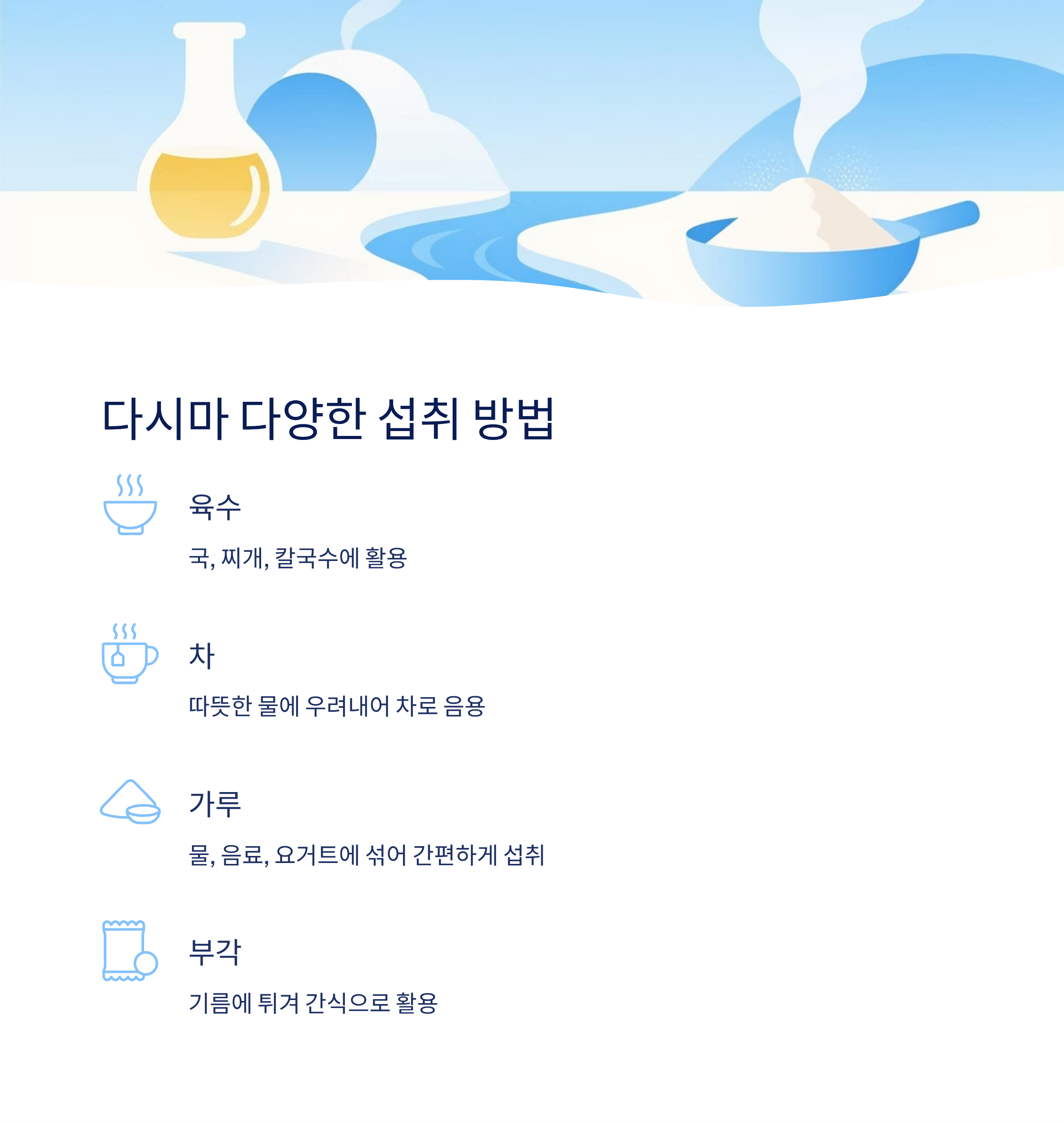- 다시마 가루: 물·음료·요거트에 섞어 간편하게 섭취