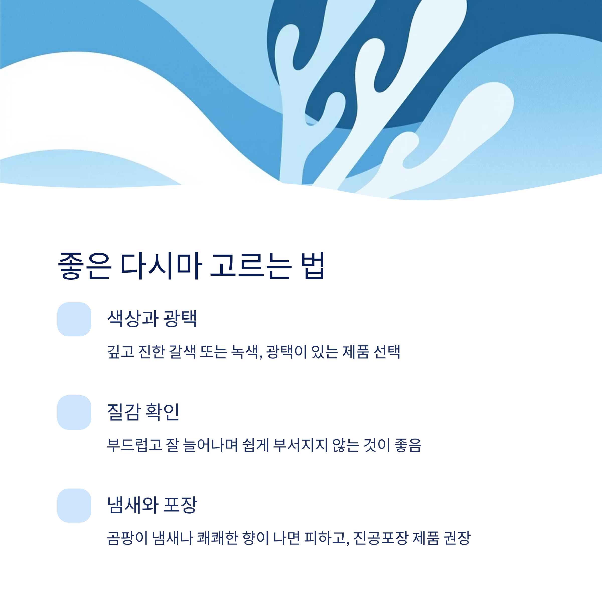 👉 신선한 다시마를 잘 고르고, 육수·차·부각 등으로 다양하게 활용해 건강한 식단에 포함해 보세요.