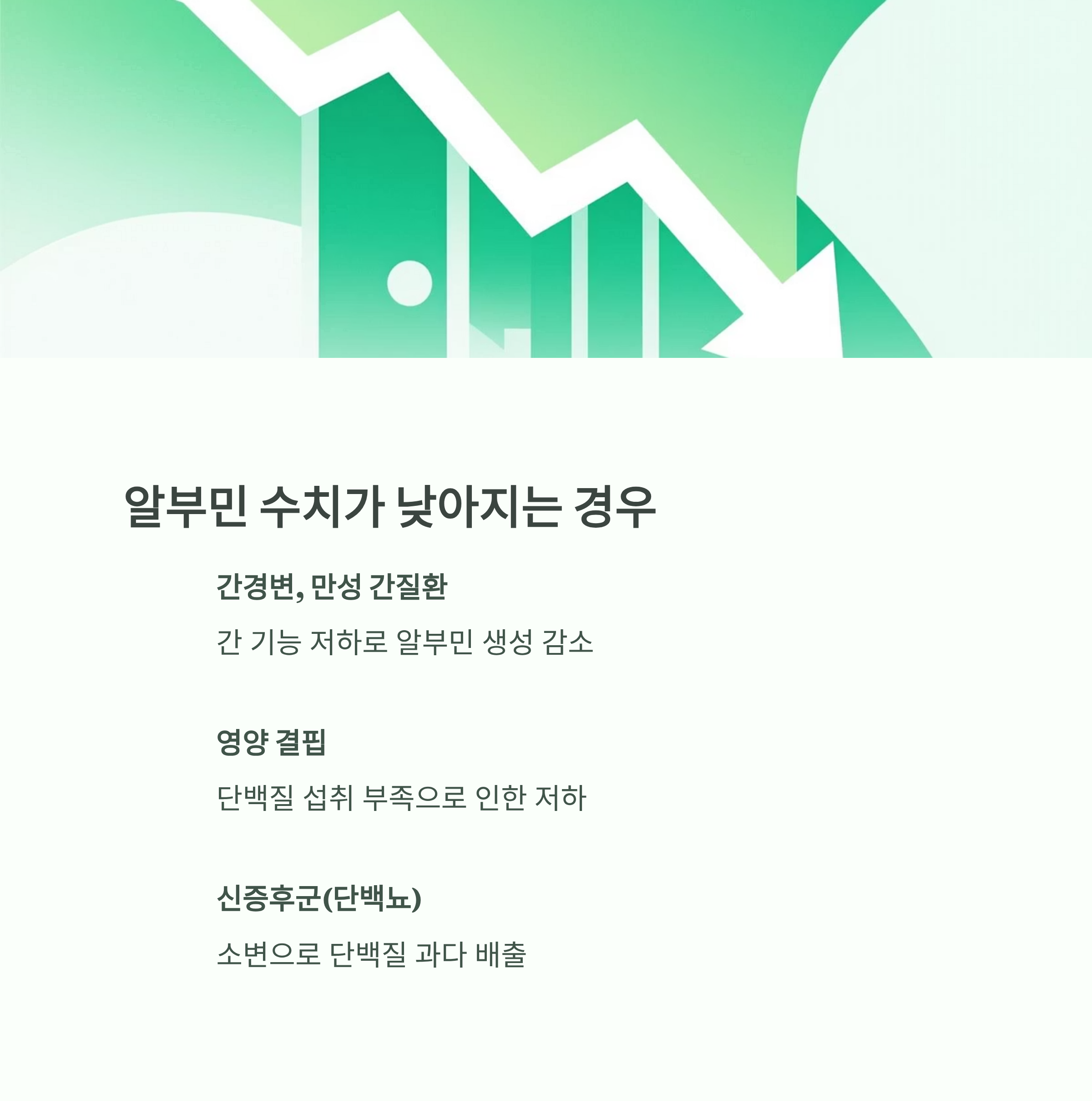 - 간질환 환자, 신부전 환자는 알부민 수치 저하 시 전문의 관리가 필요