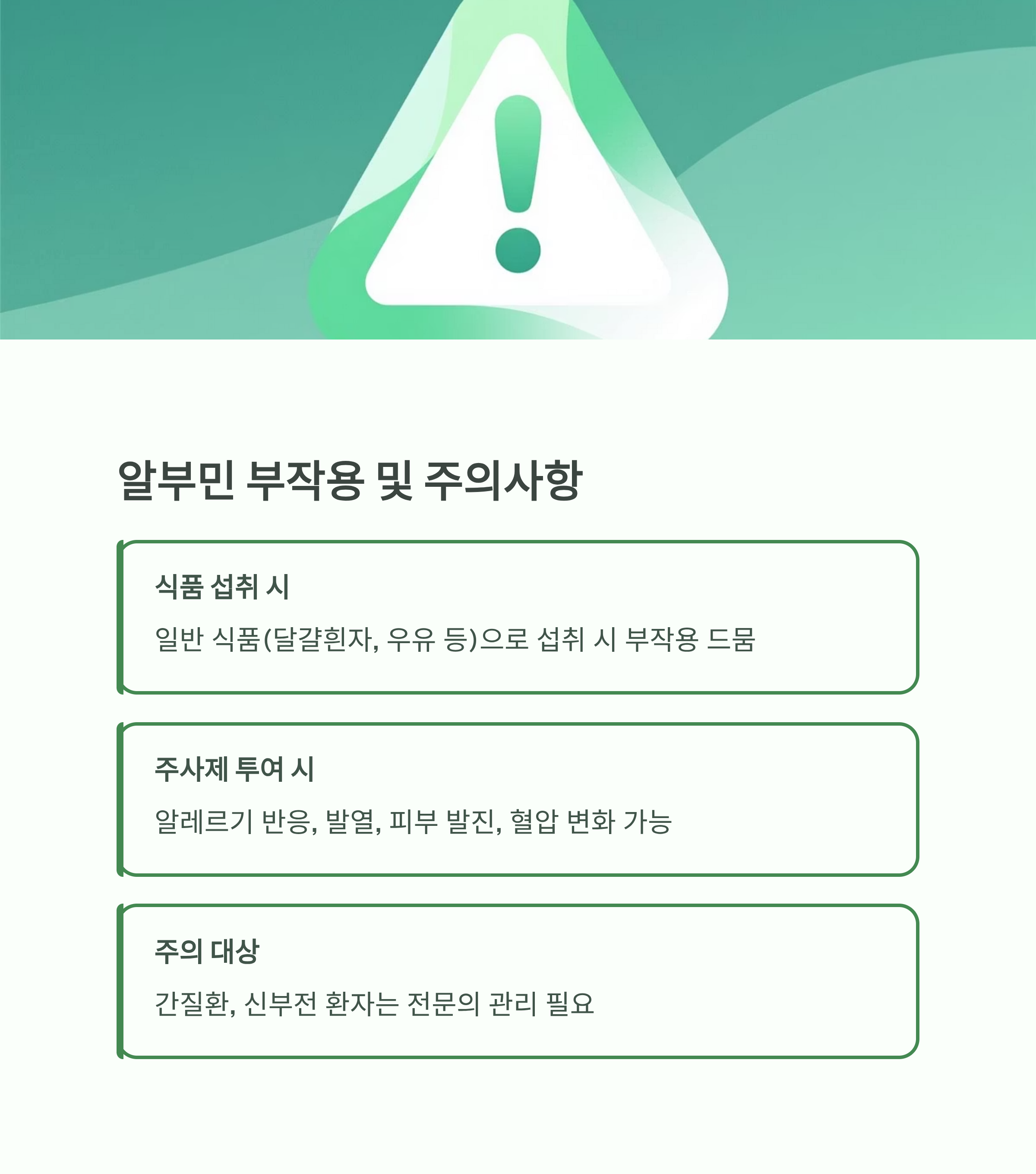 - 일반 식품 내 알부민 (달걀흰자, 우유, 해산물 등)은 부작용이 드뭅니다.