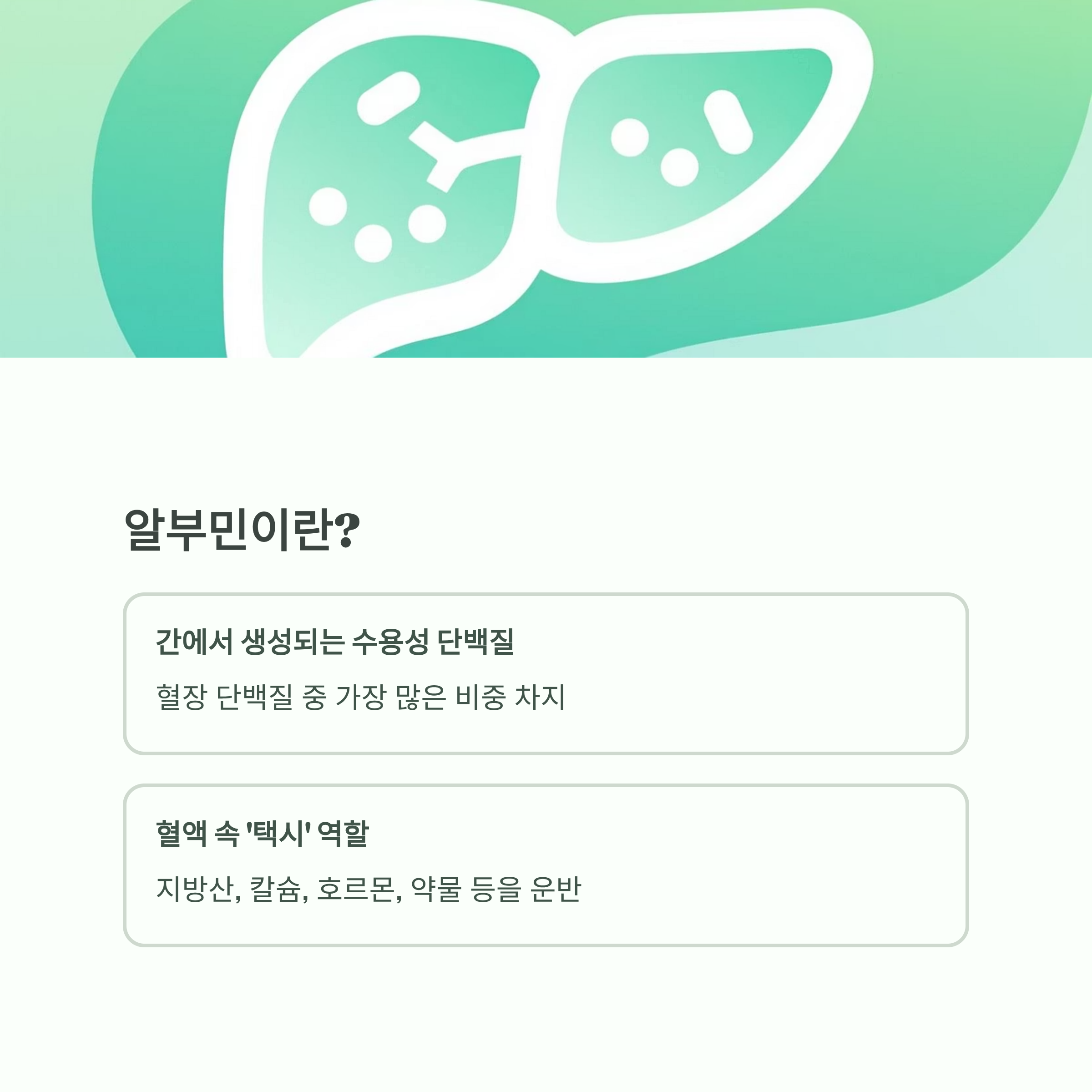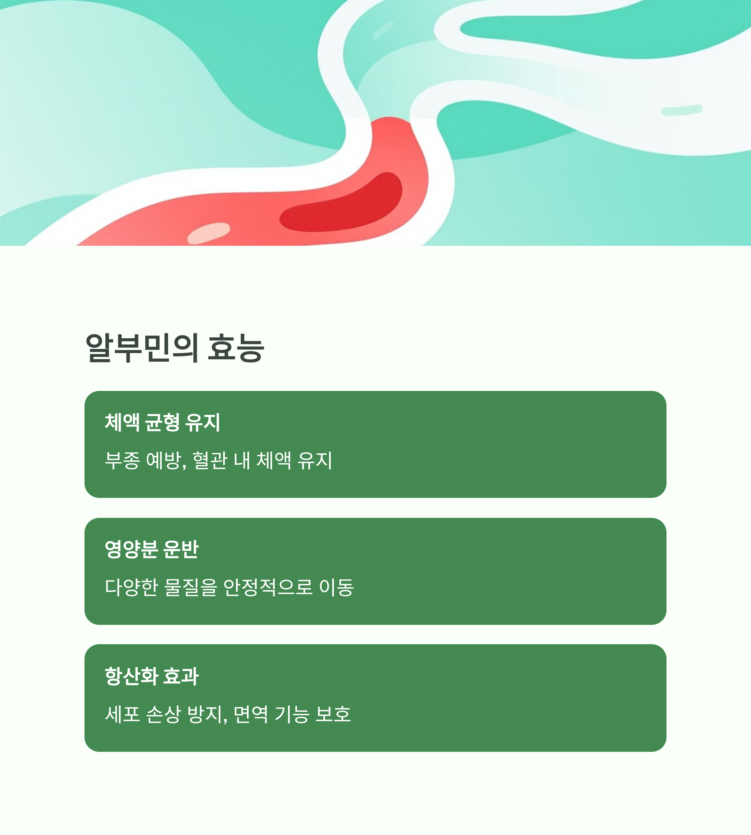 👉 쉽게 말해, 알부민은 혈액 속에서 ‘택시 역할’을 하는 단백질입니다.
