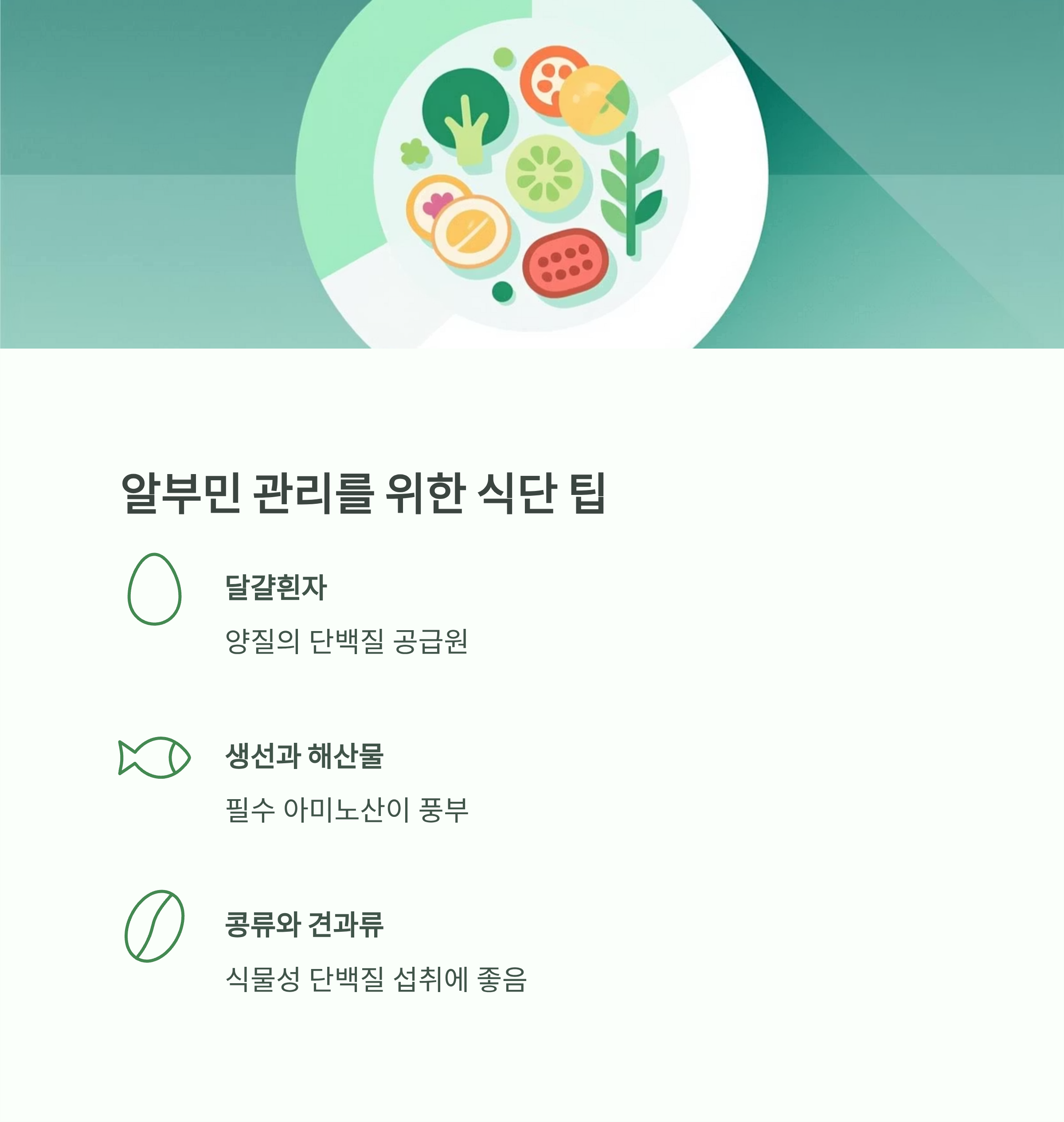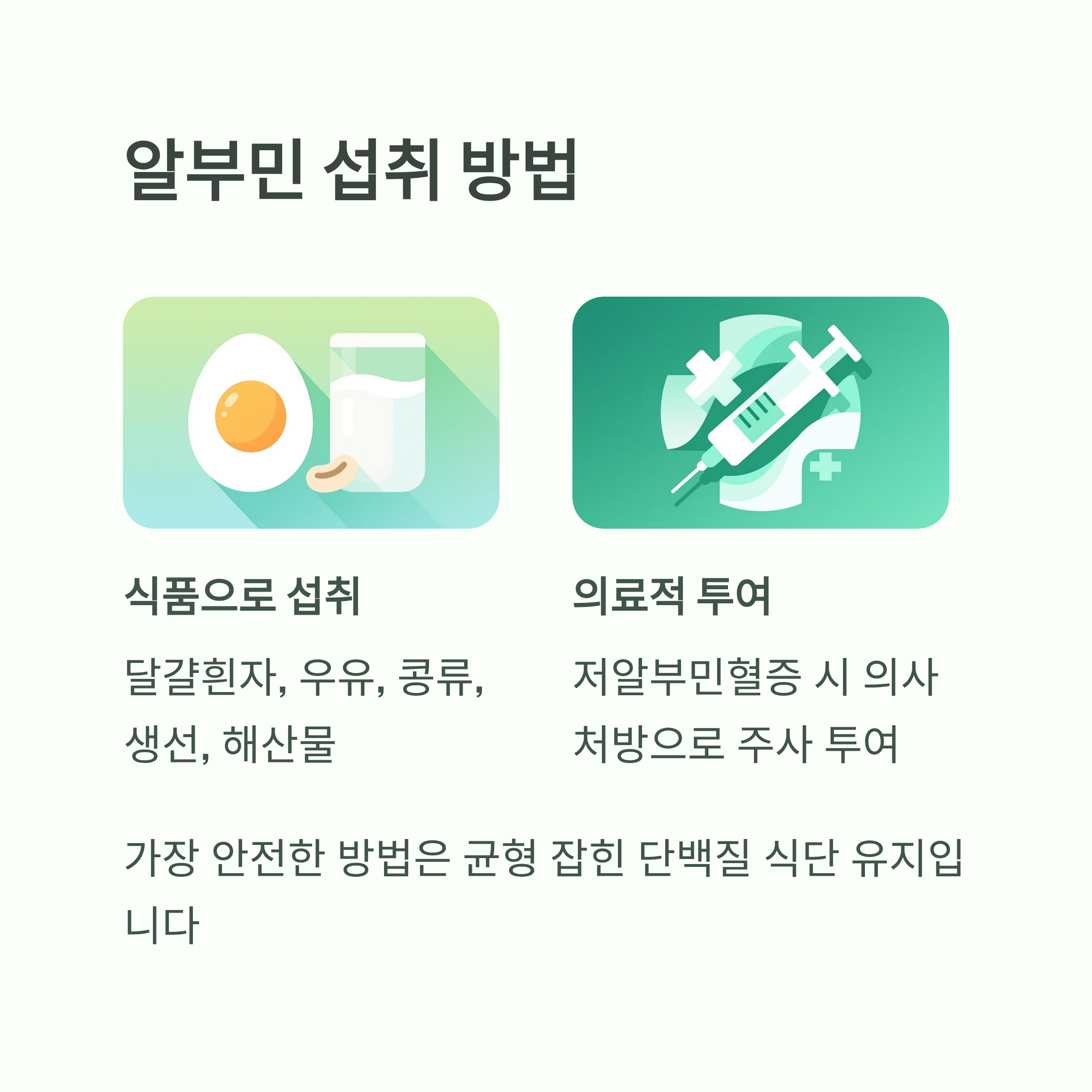 👉 평소에는 달걀흰자, 우유, 해산물, 콩류 등을 통한 자연스러운 단백질 섭취로 알부민 수치를 건강하게 유지하는 것이 가장 안전합니다.