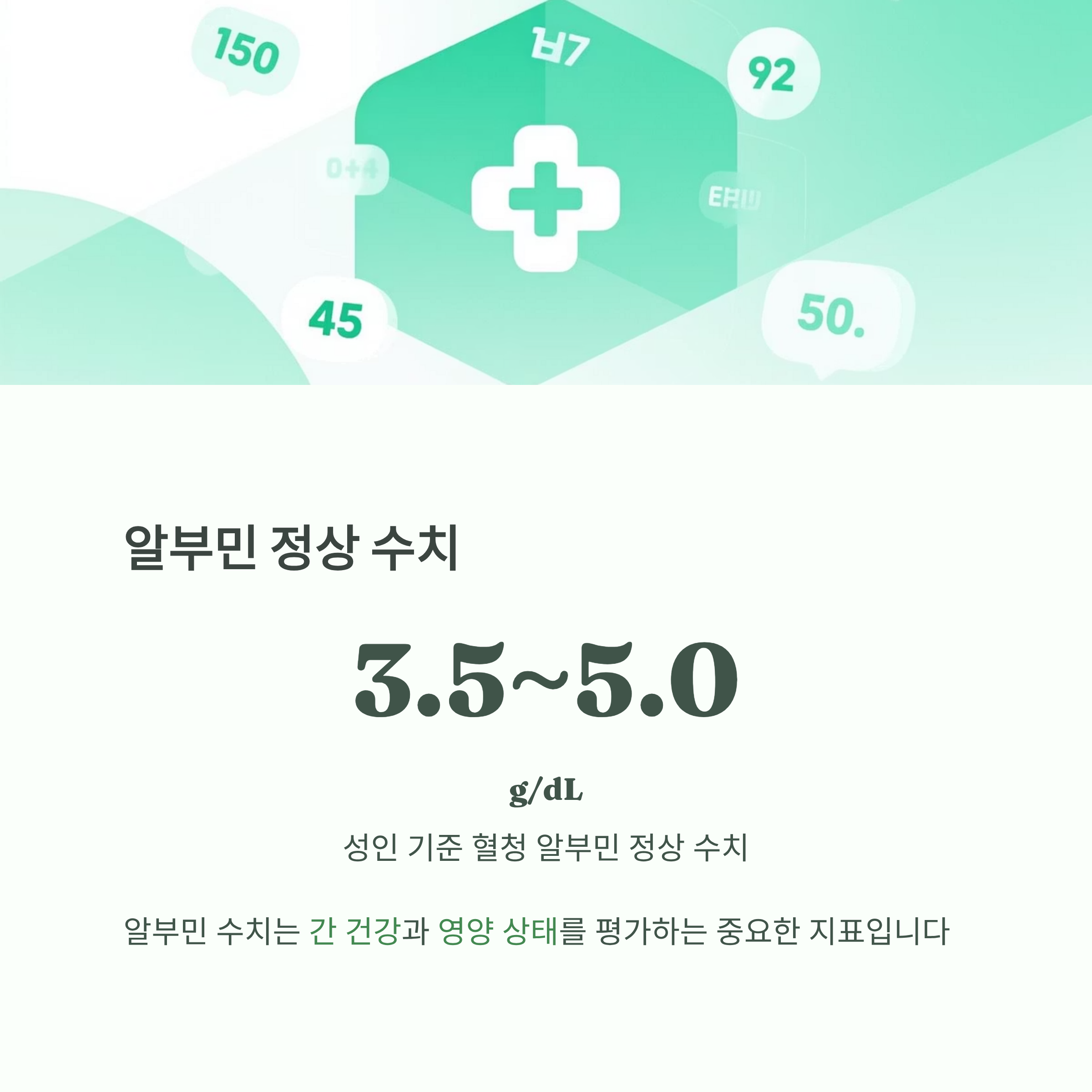 - 혈청 알부민 정상 수치: 3.5 ~ 5.0 g/dL (성인 기준)