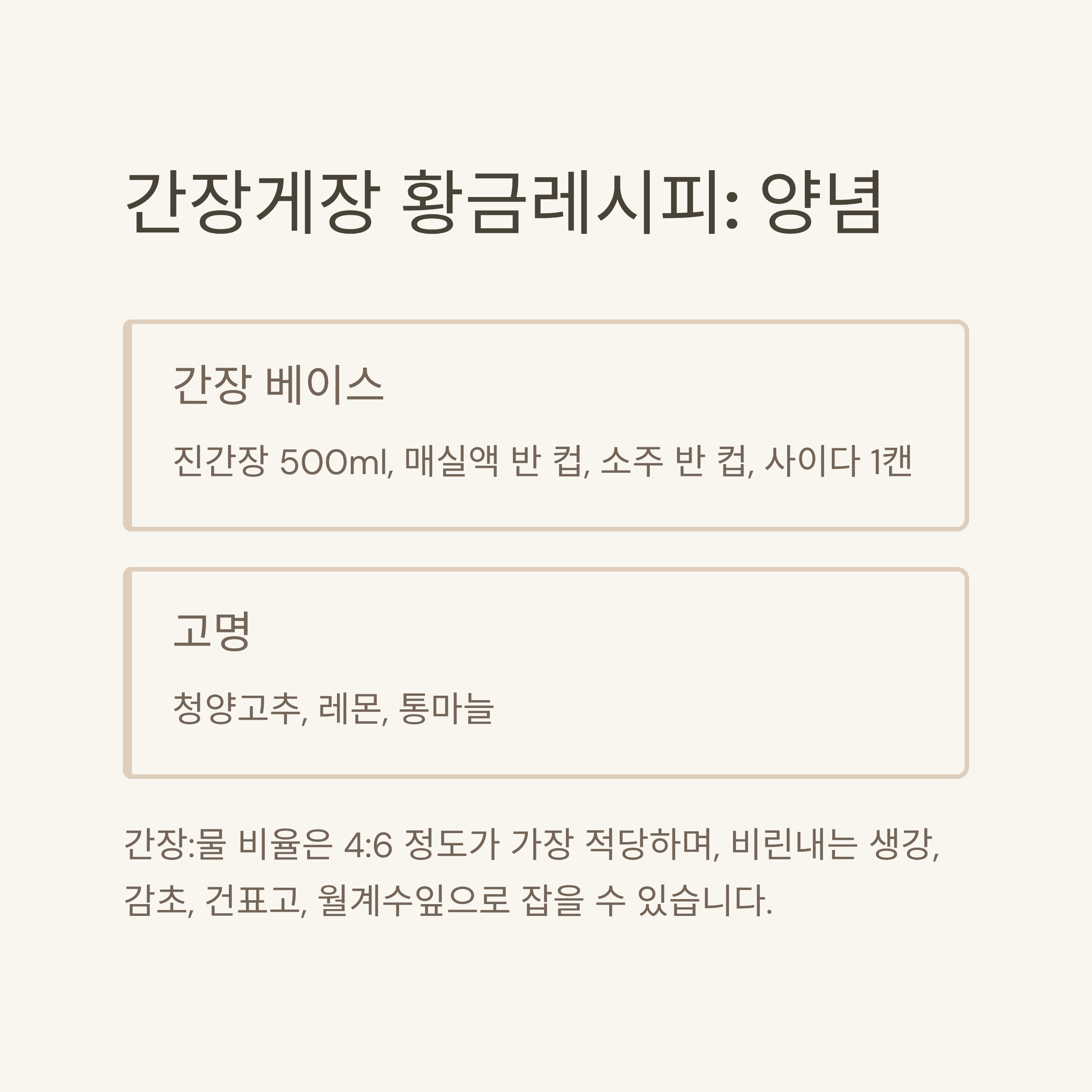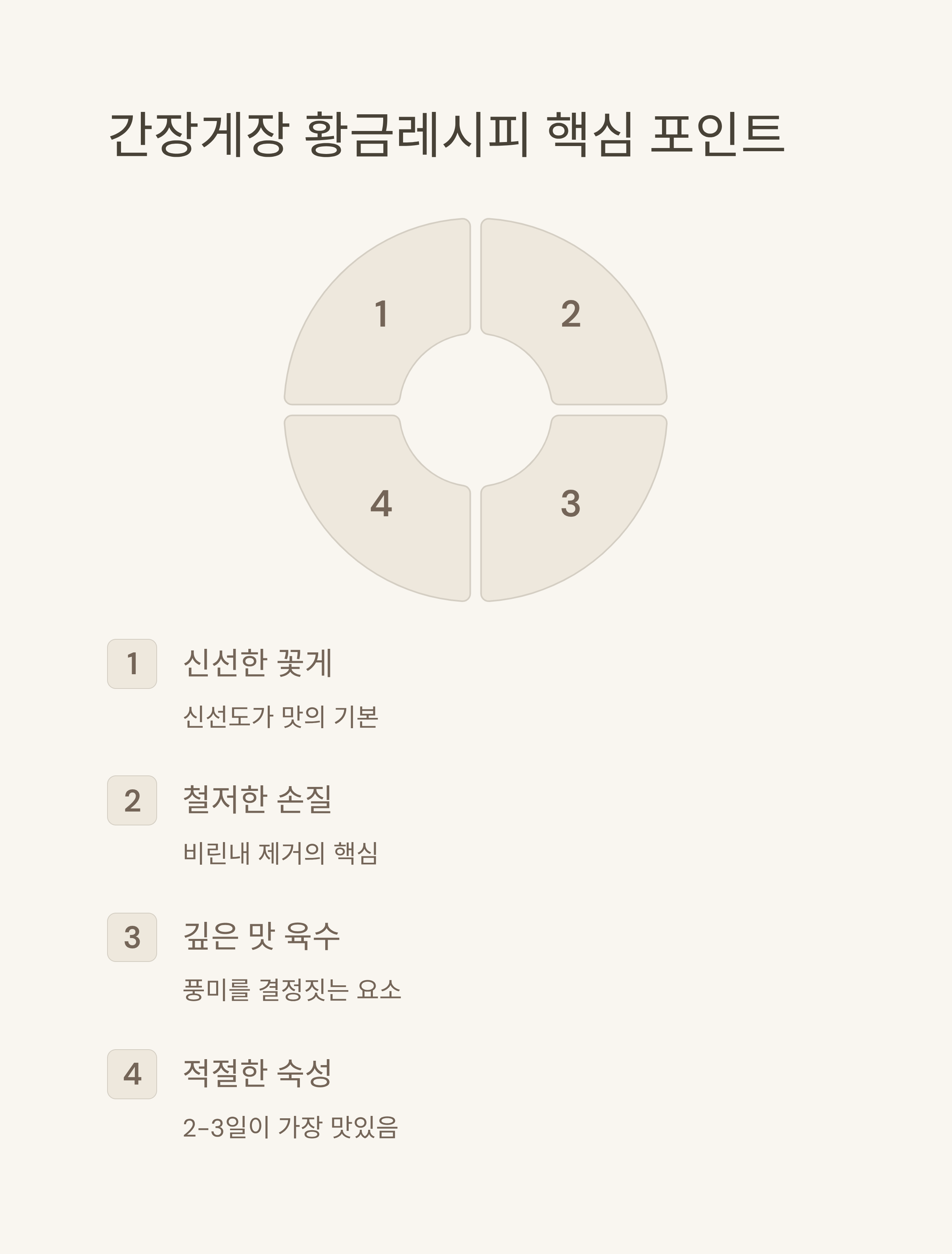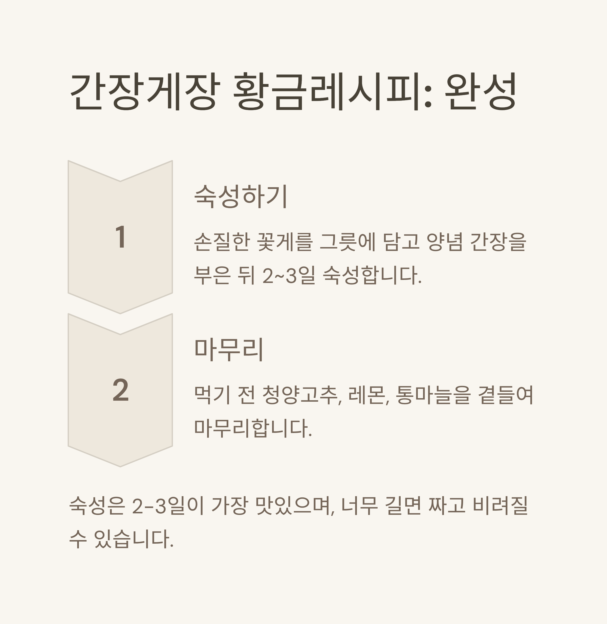 간장게장 황금레시피의 핵심은 신선한 꽃게 선택, 철저한 손질, 깊은 맛을 내는 육수입니다. 간장 비율과 숙성 기간만 잘 맞추면 집에서도 맛집 못지않은 간장게장을 즐길 수 있습니다.