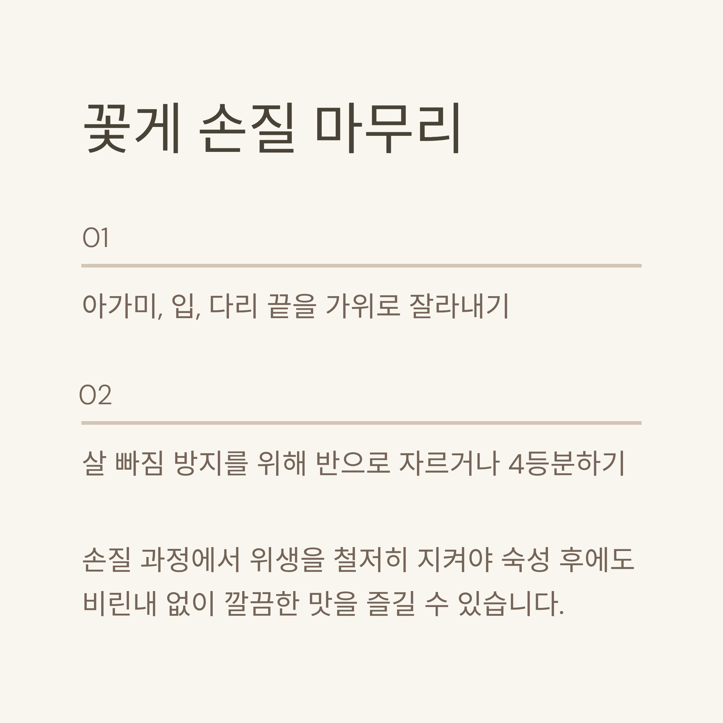 👉 손질 과정에서 위생을 철저히 지켜야 숙성 후에도 비린내 없이 깔끔한 맛을 즐길 수 있습니다.