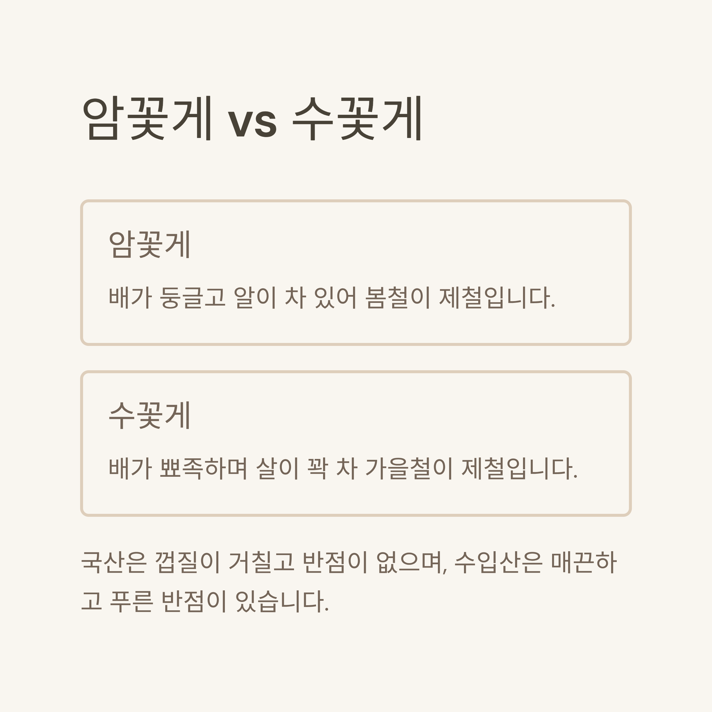 - 암꽃게는 배가 둥글고 알이 차 있어 봄철이 제철.