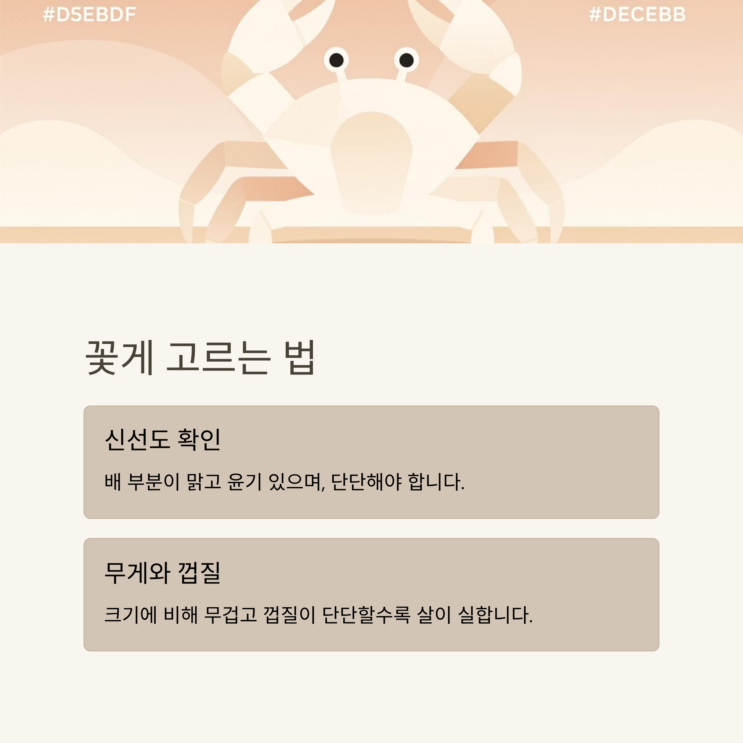 - 다리 상태: 다리가 온전한 것이 신선하지만, 떨어져 있어도 살이 실할 수 있음.