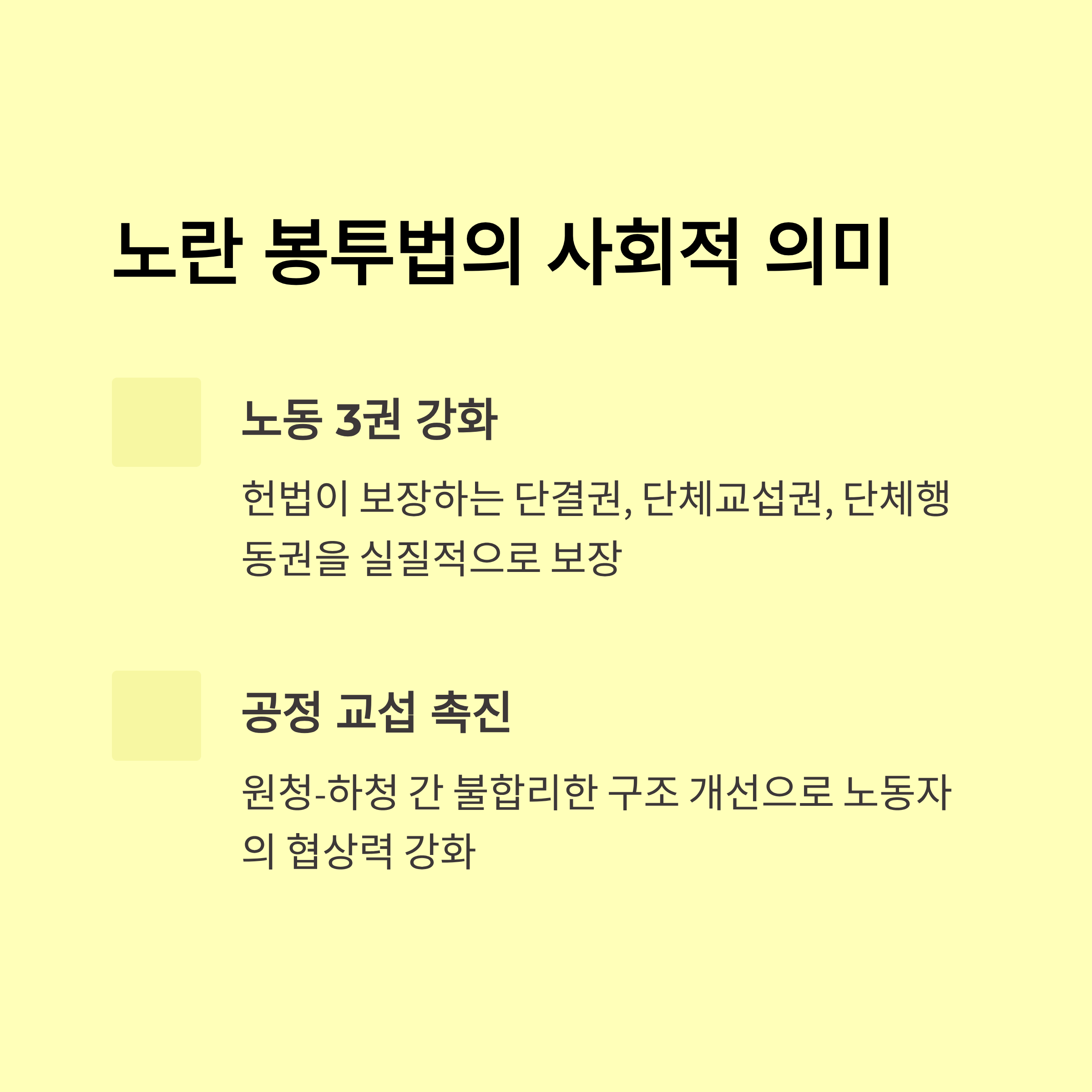 👉 요약하면, 노란 봉투법은 노동 불평등 완화와 노동권 실질 보장을 목표로 합니다.