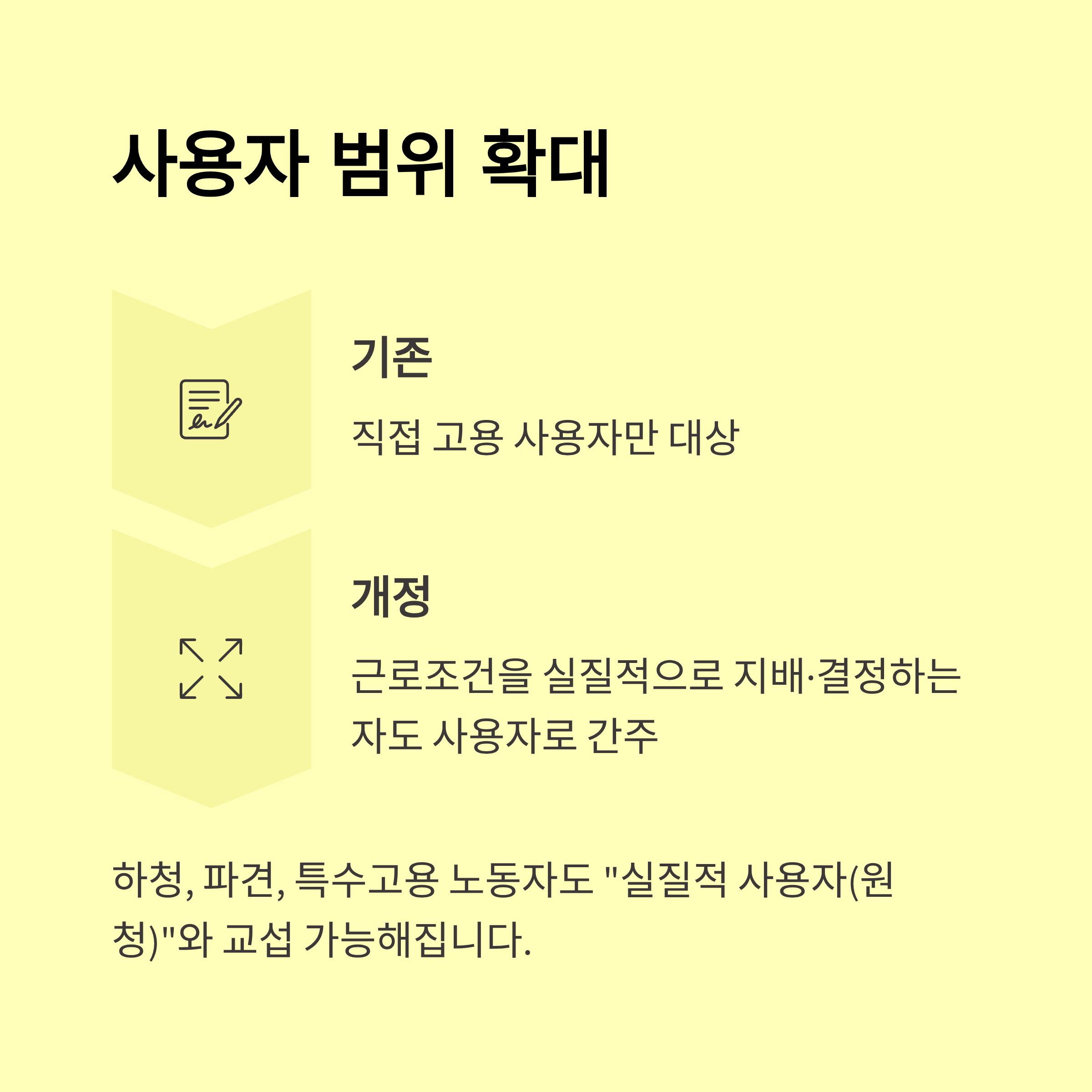 - 개정: 근로조건을 실질적으로 지배·결정하는 자도 사용자로 간주