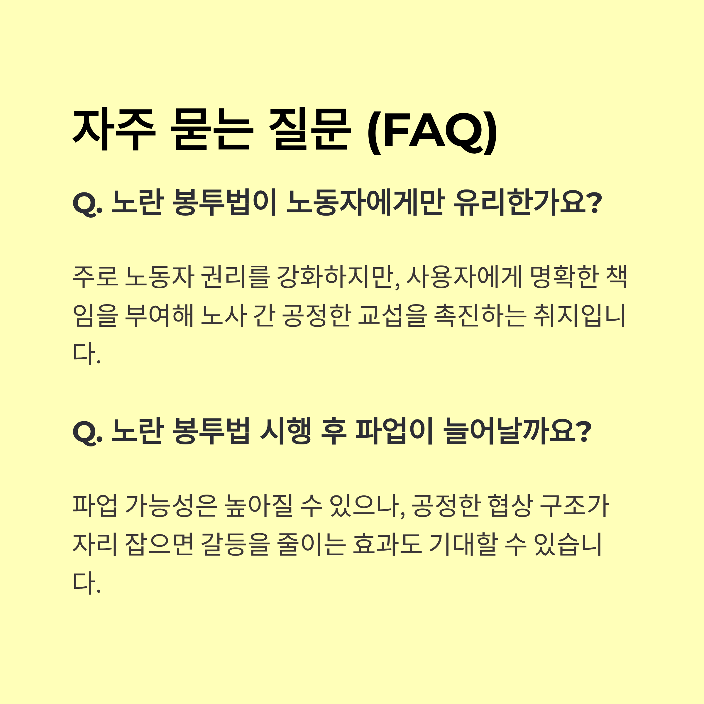 A1. 주로 노동자 권리를 강화하는 법이지만, 동시에 사용자에게 명확한 책임을 부여해 노사 간 공정한 교섭을 촉진하는 취지입니다.