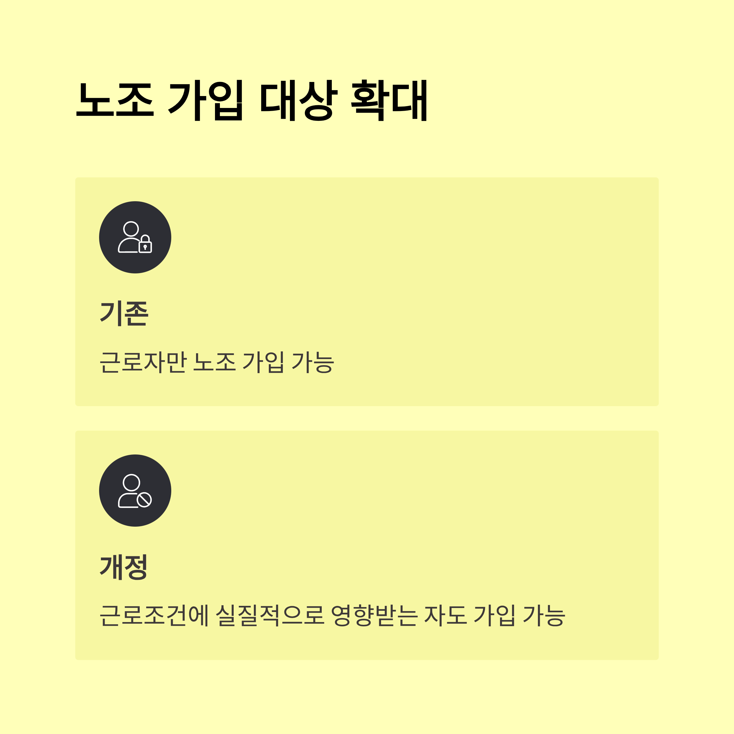 - 개정: 근로조건에 실질적으로 영향받는 자도 가입 가능
