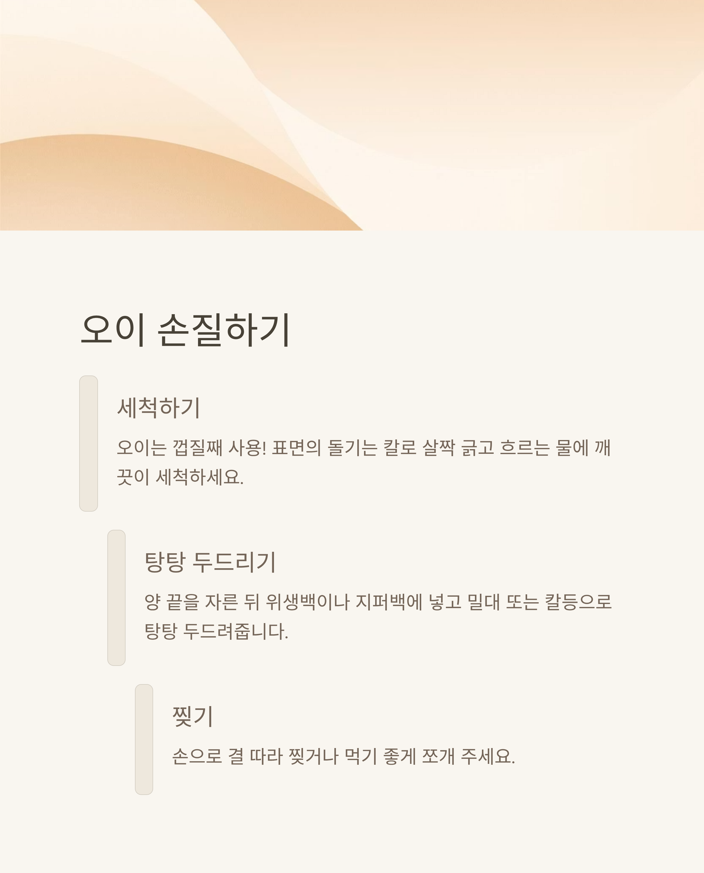 - 탕탕 손질은 너무 세게 말고, 아삭함 유지할 정도로 두드리는 것이 핵심