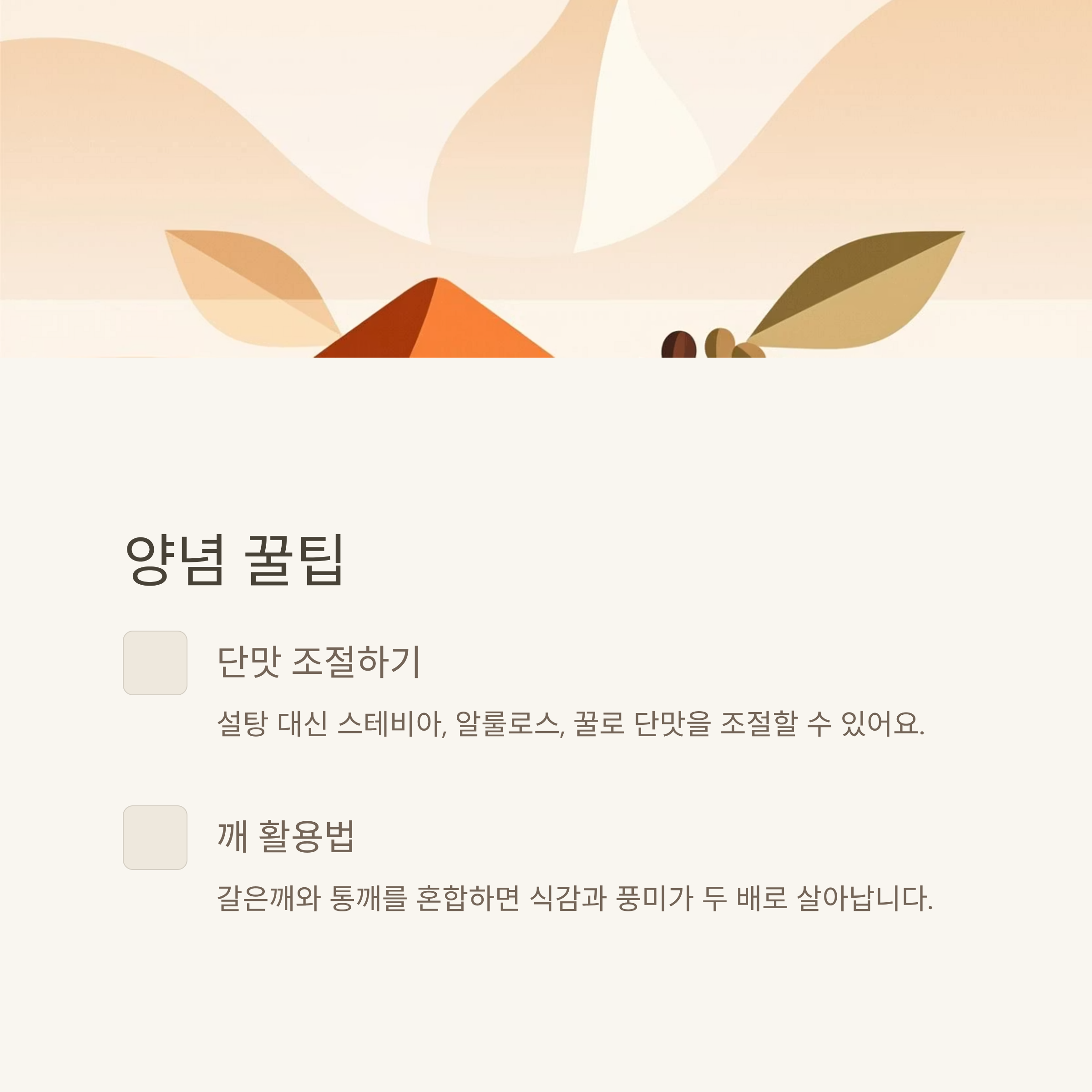 깨를 듬뿍 넣을수록 풍미가 살아납니다. 매콤하게 즐기고 싶다면 청양고추를 추가하세요.