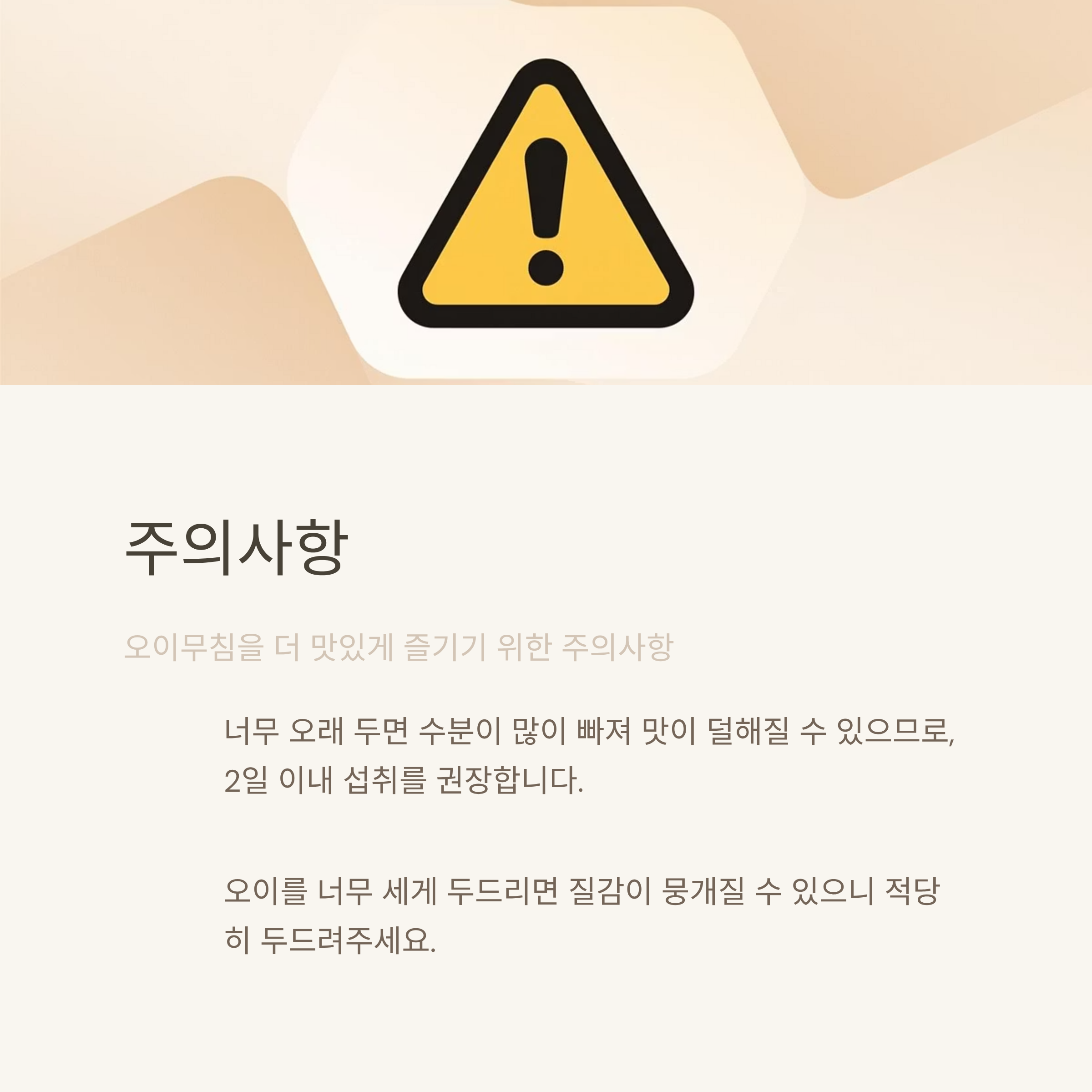 - 너무 오래 두면 수분이 많이 빠져 맛이 덜해질 수 있으므로, 2일 이내 섭취 권장