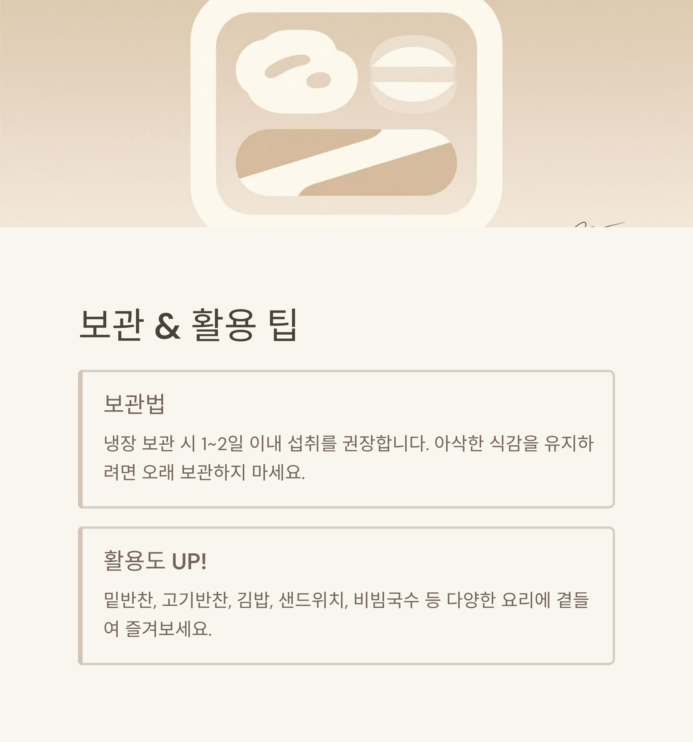- 냉장 보관 시 1~2일 이내 섭취 권장 (아삭함 유지)