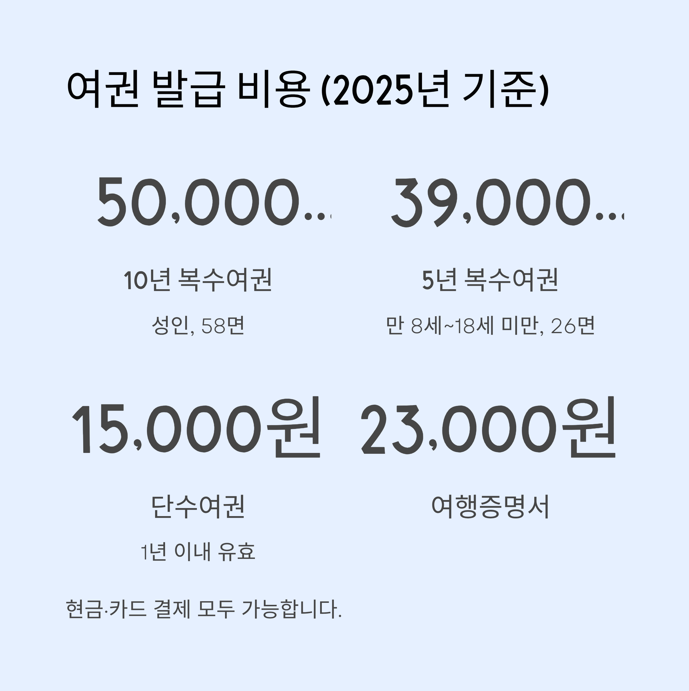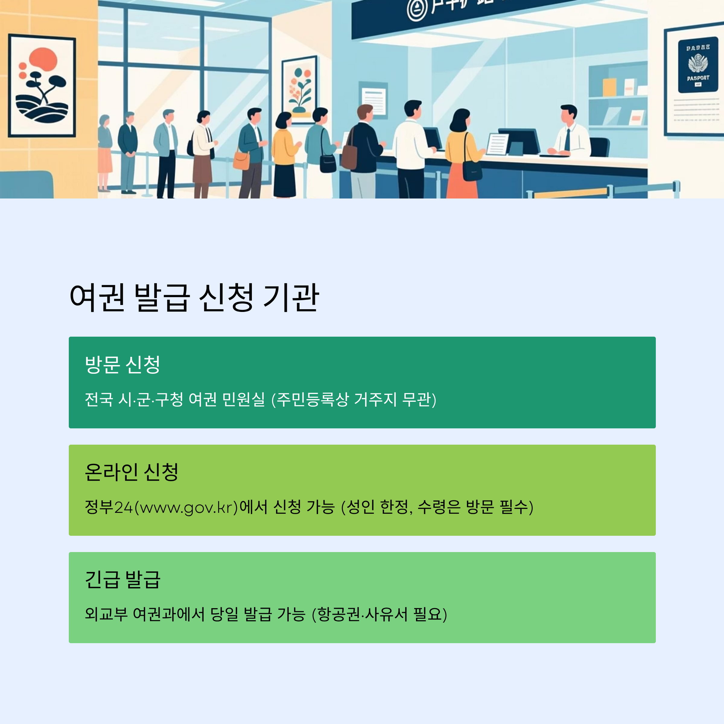 - 긴급 발급: 외교부 여권과에서 항공권 등 증빙 제출 시 당일 발급 가능