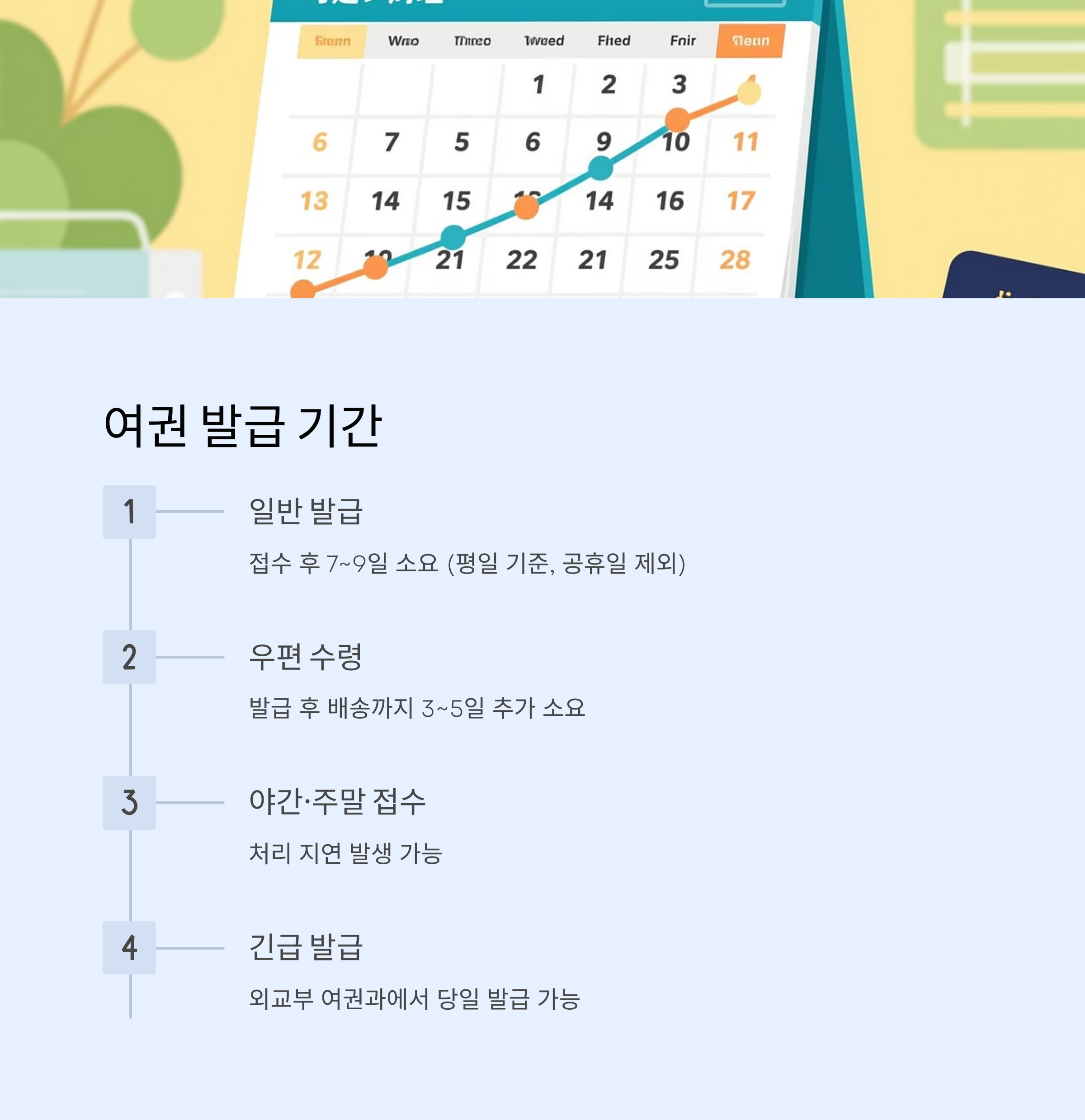 여권 발급은 평균 7~9일이 소요되며, 우편 수령 시 추가 시간이 필요합니다. 급히 출국해야 하는 경우에는 외교부 긴급 발급 제도를 활용하세요.