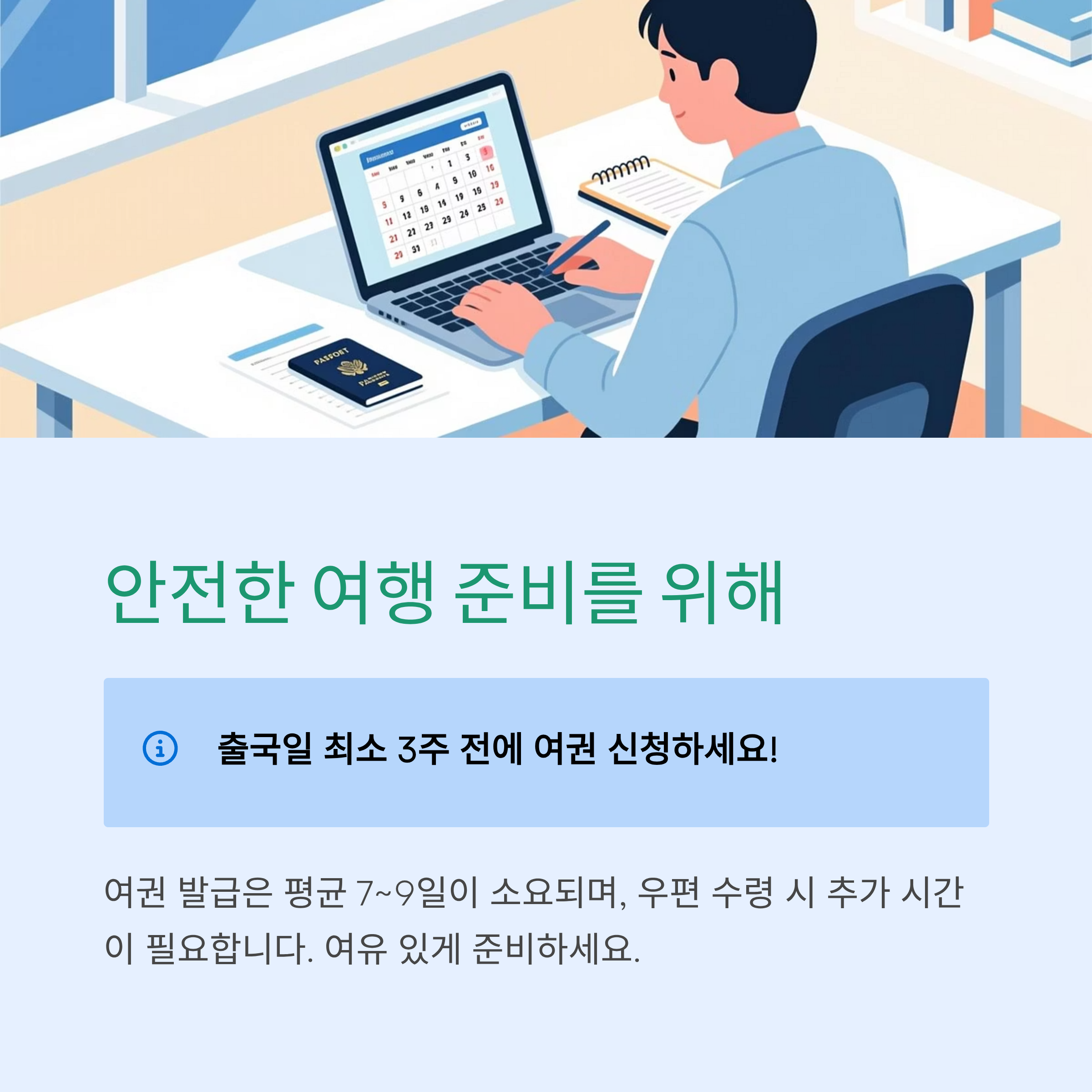여행을 계획하고 있다면, 여권 발급 시기와 준비물을 미리 확인해 불편 없이 출국 준비하시길 바랍니다.