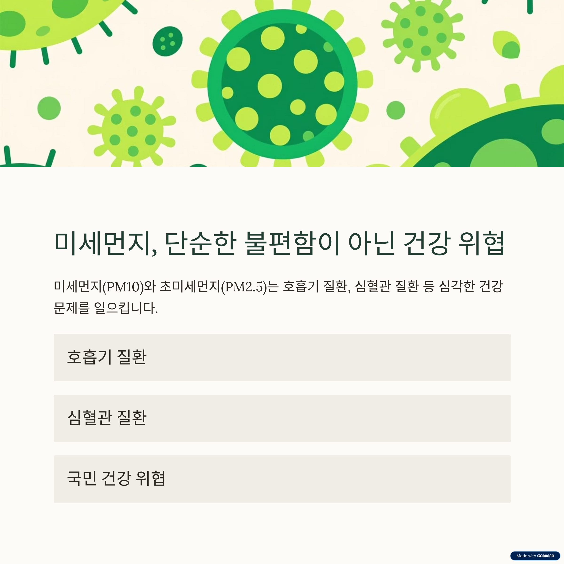 - 건강 위협: PM10 및 초미세먼지(PM2.5)가 국민 건강에 악영향
