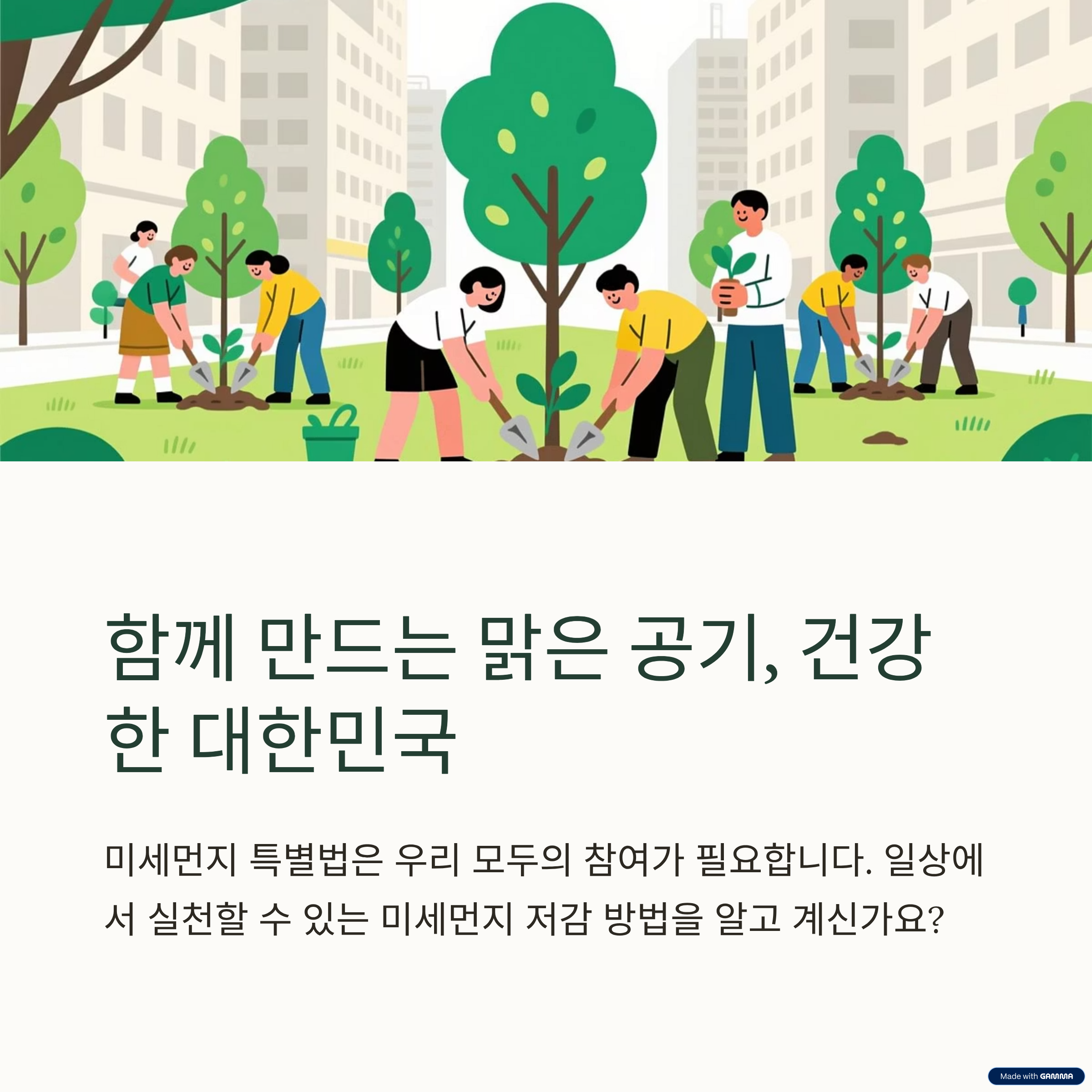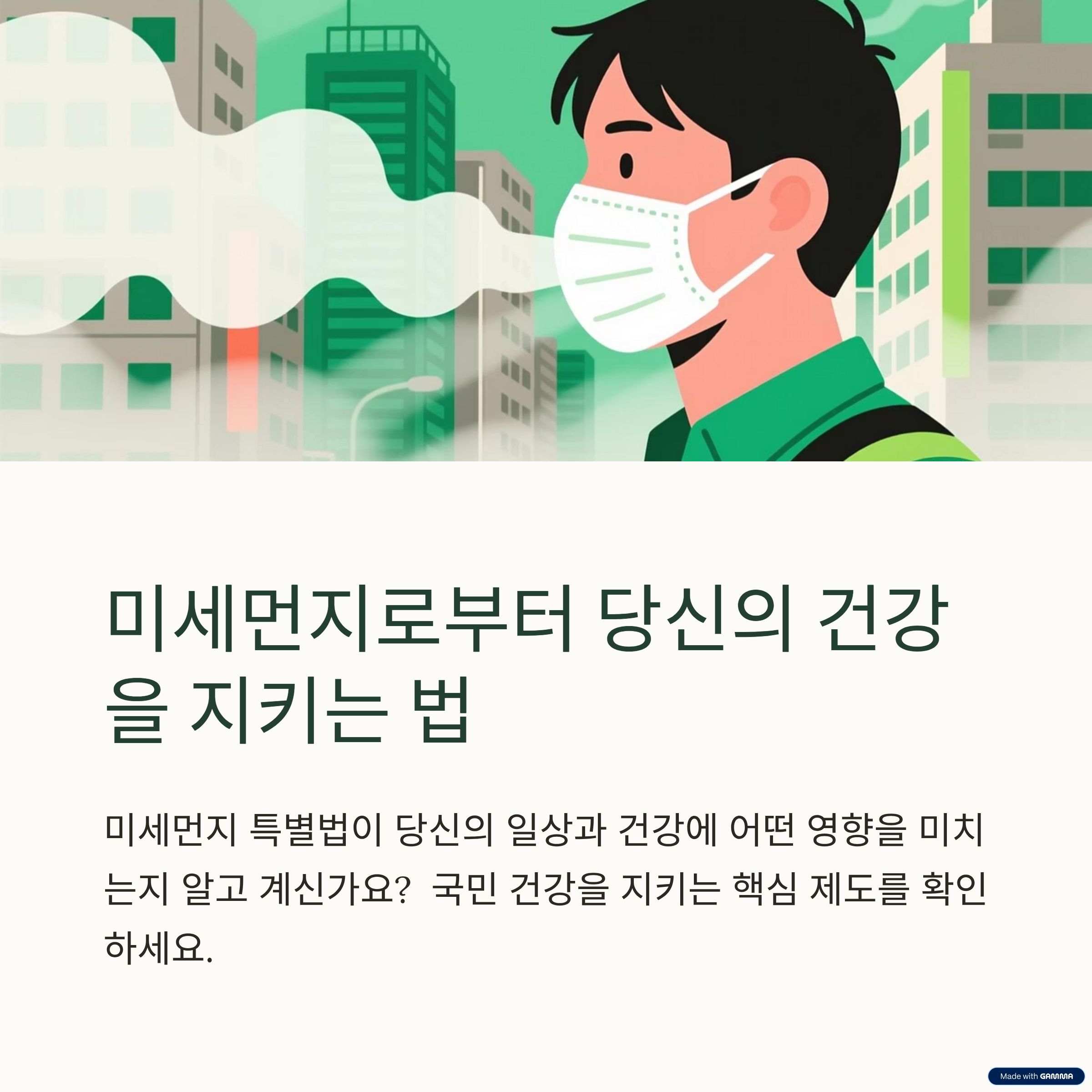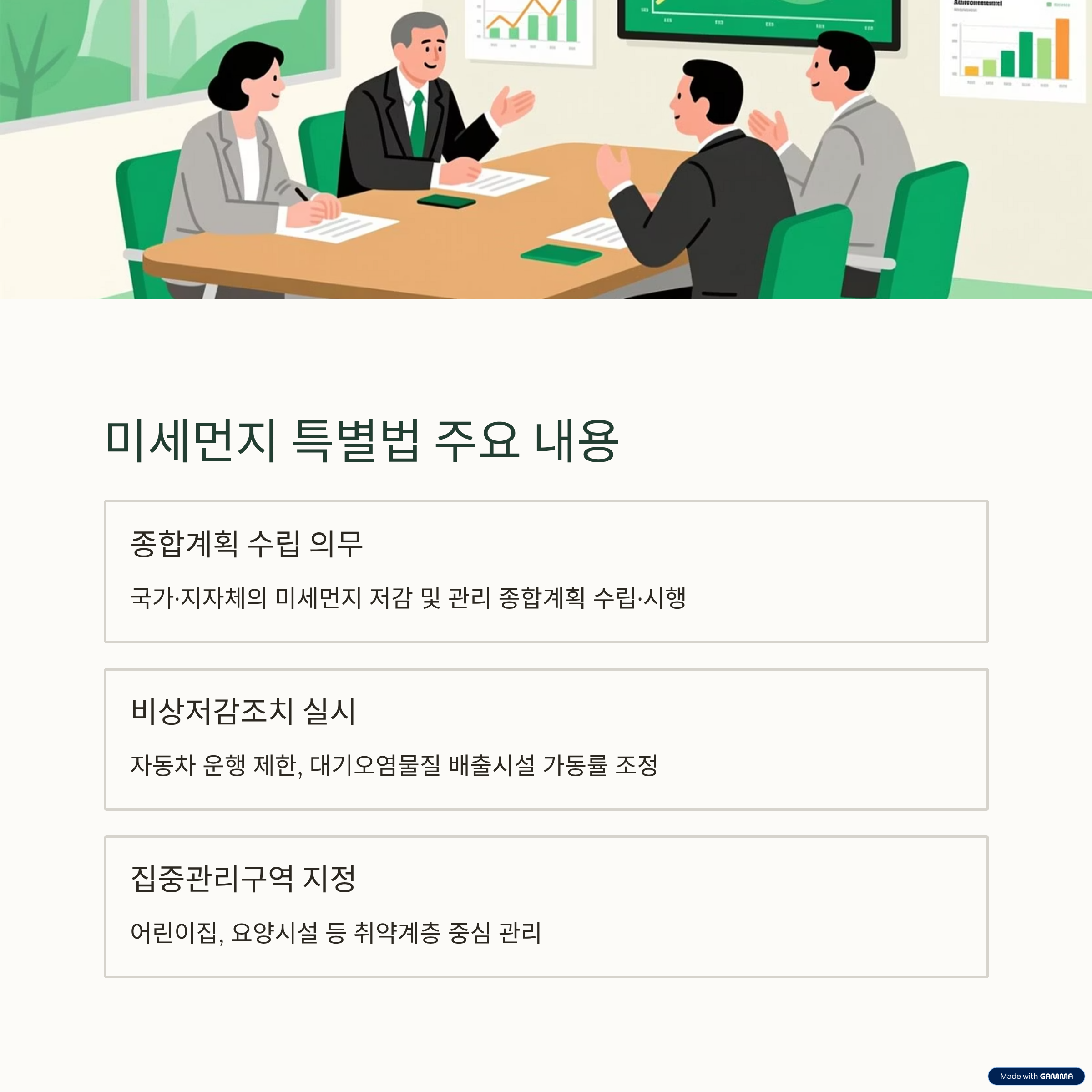 미세먼지 특별법은 국민 건강 보호와 쾌적한 생활 환경 조성을 위해 제정된 법률로, 국가·지자체뿐 아니라 국민과 사업주 모두가 참여해야 하는 체계적 관리 제도입니다.
