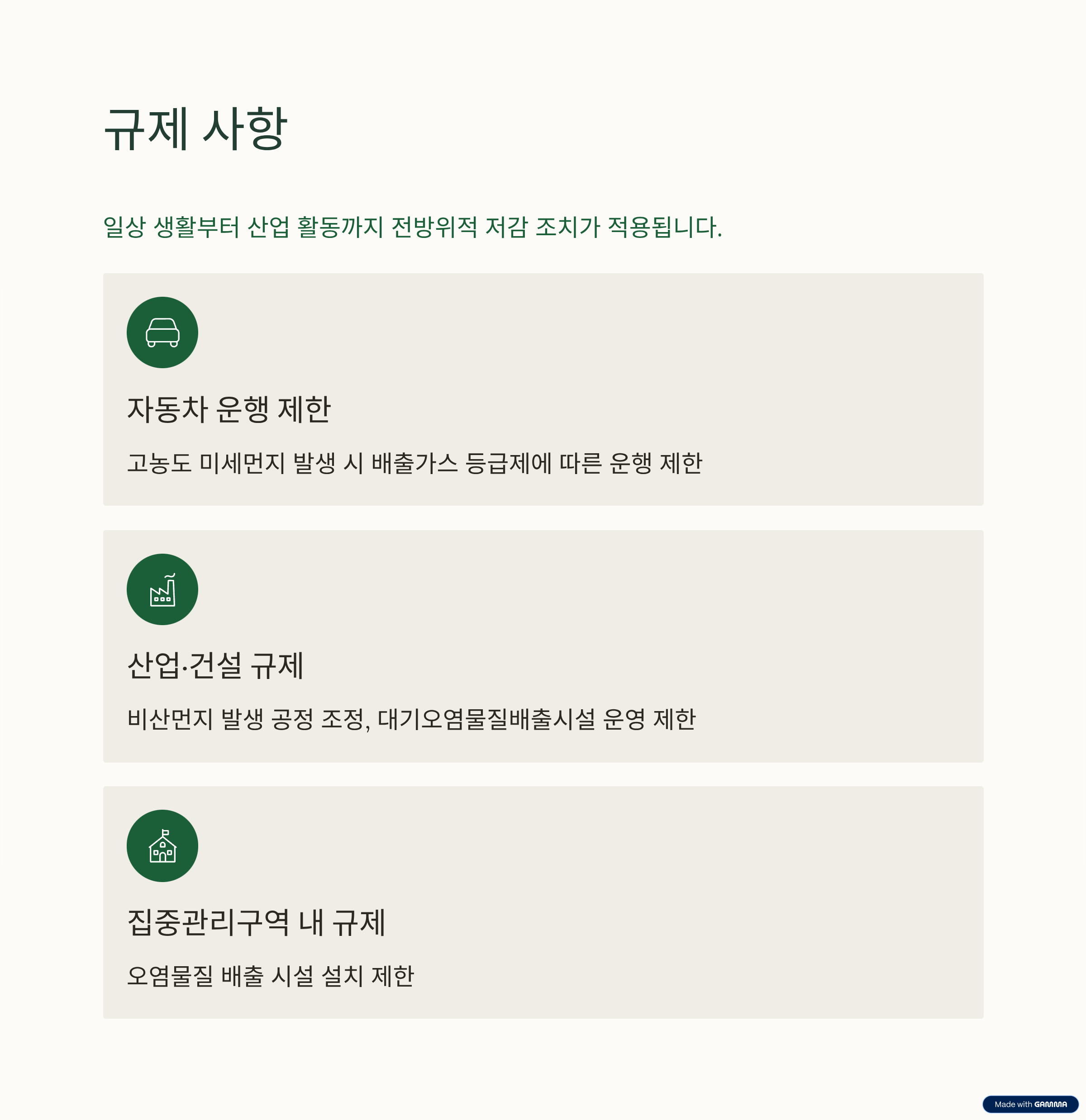 - 산업·건설 규제: 비산먼지 발생 공정 조정, 대기오염물질배출시설 운영 제한