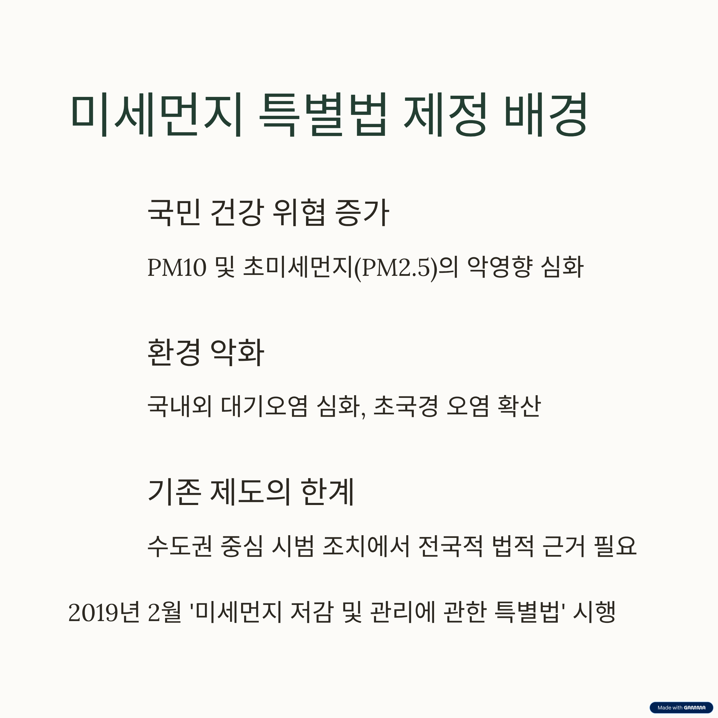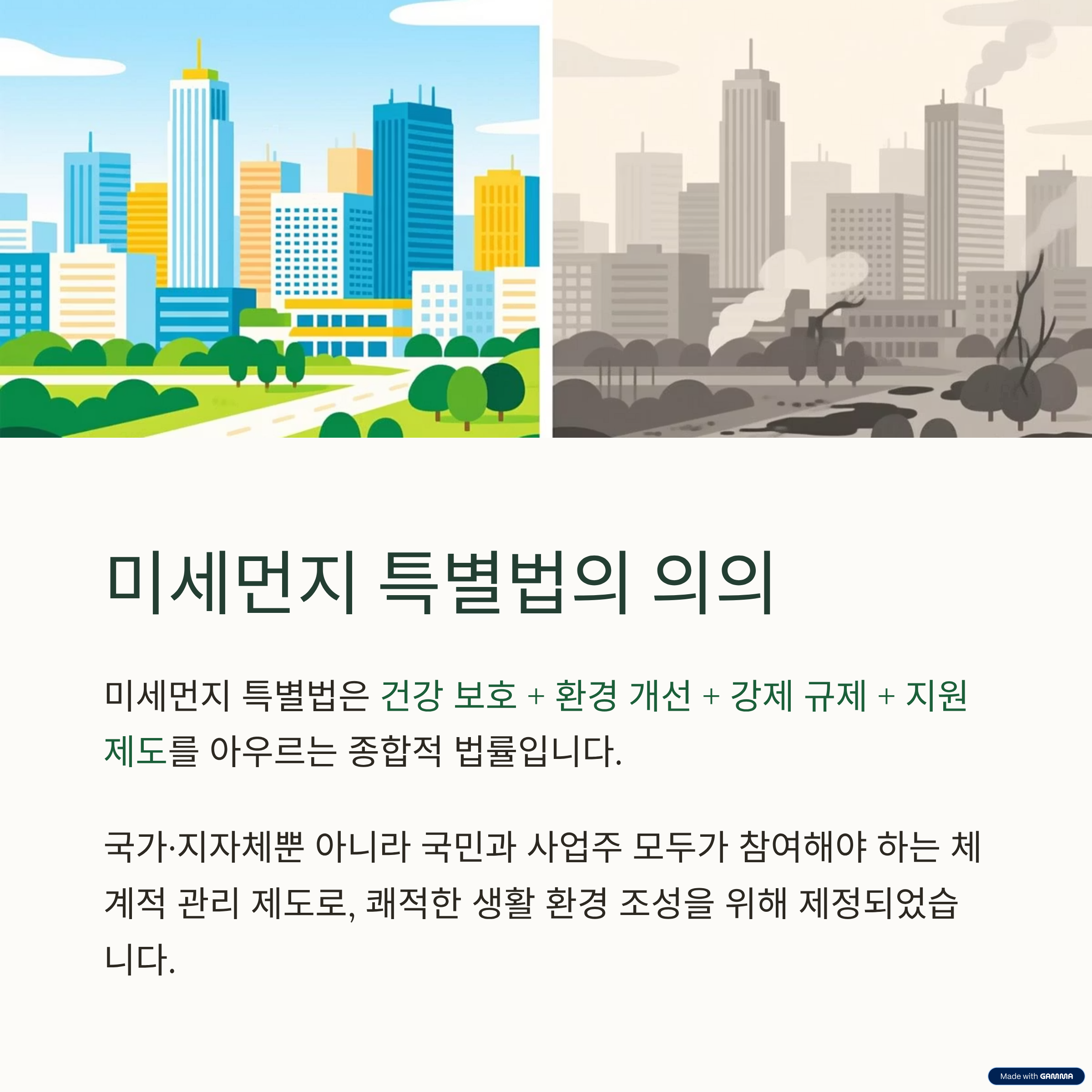 👉 즉, 미세먼지 특별법은 “건강 보호 + 환경 개선 + 강제 규제 + 지원 제도”를 아우르는 종합적 법률이라 할 수 있습니다.