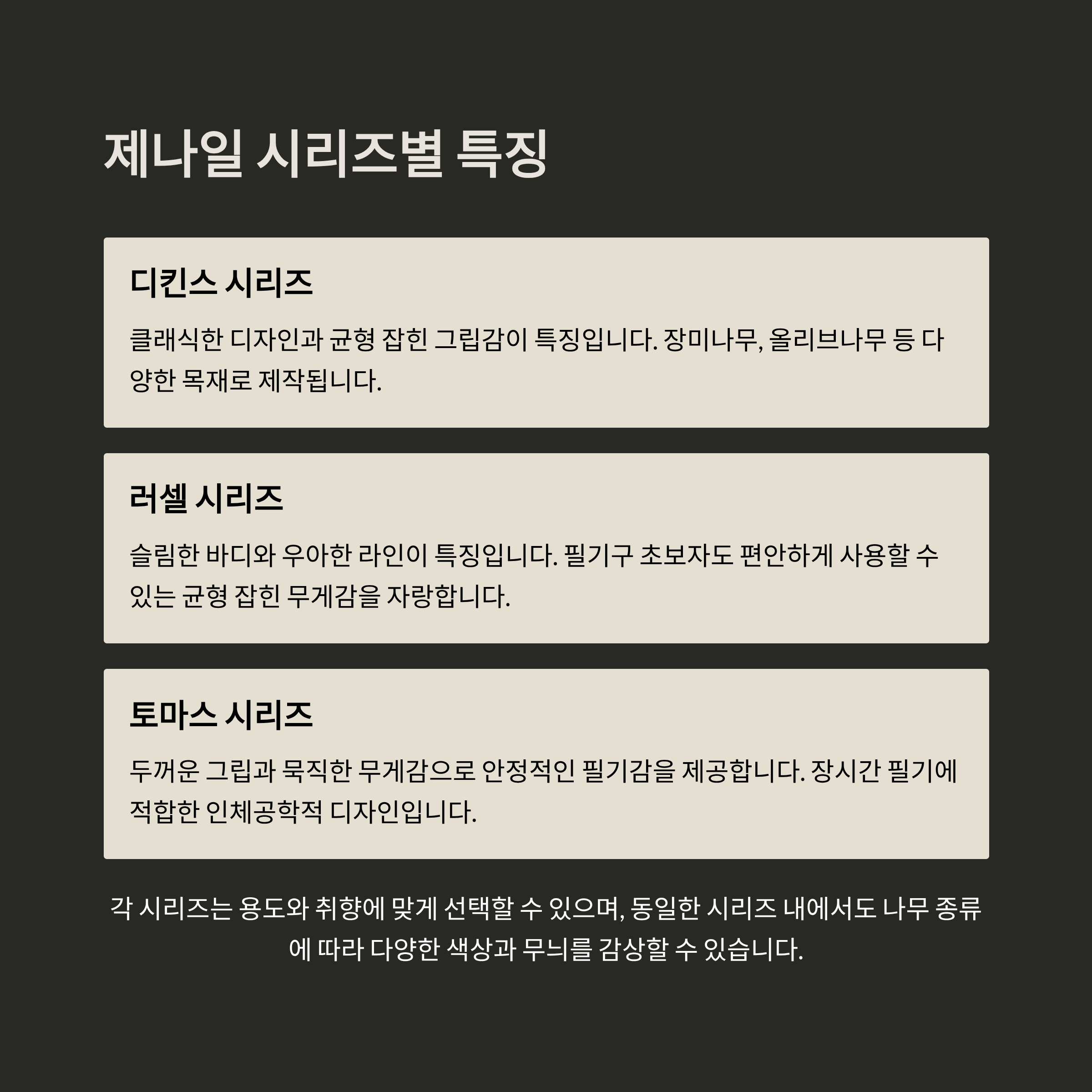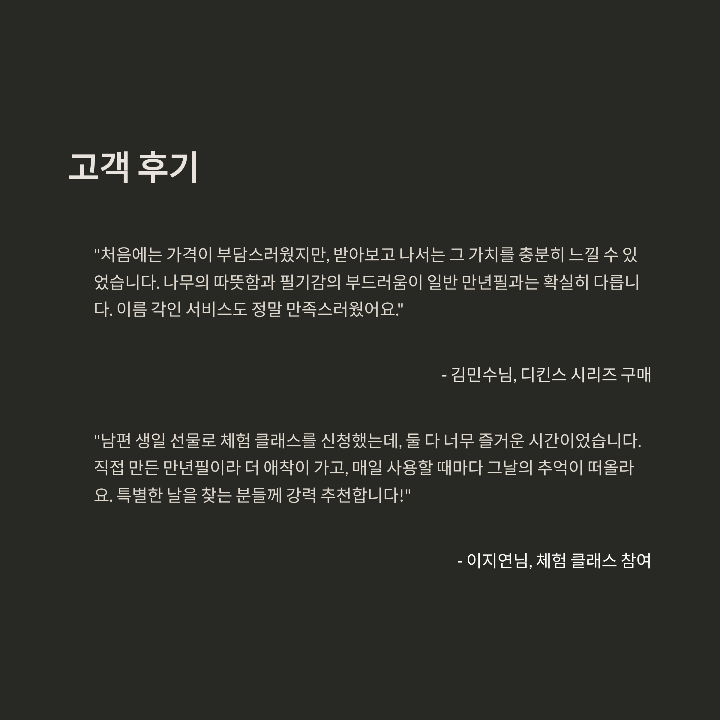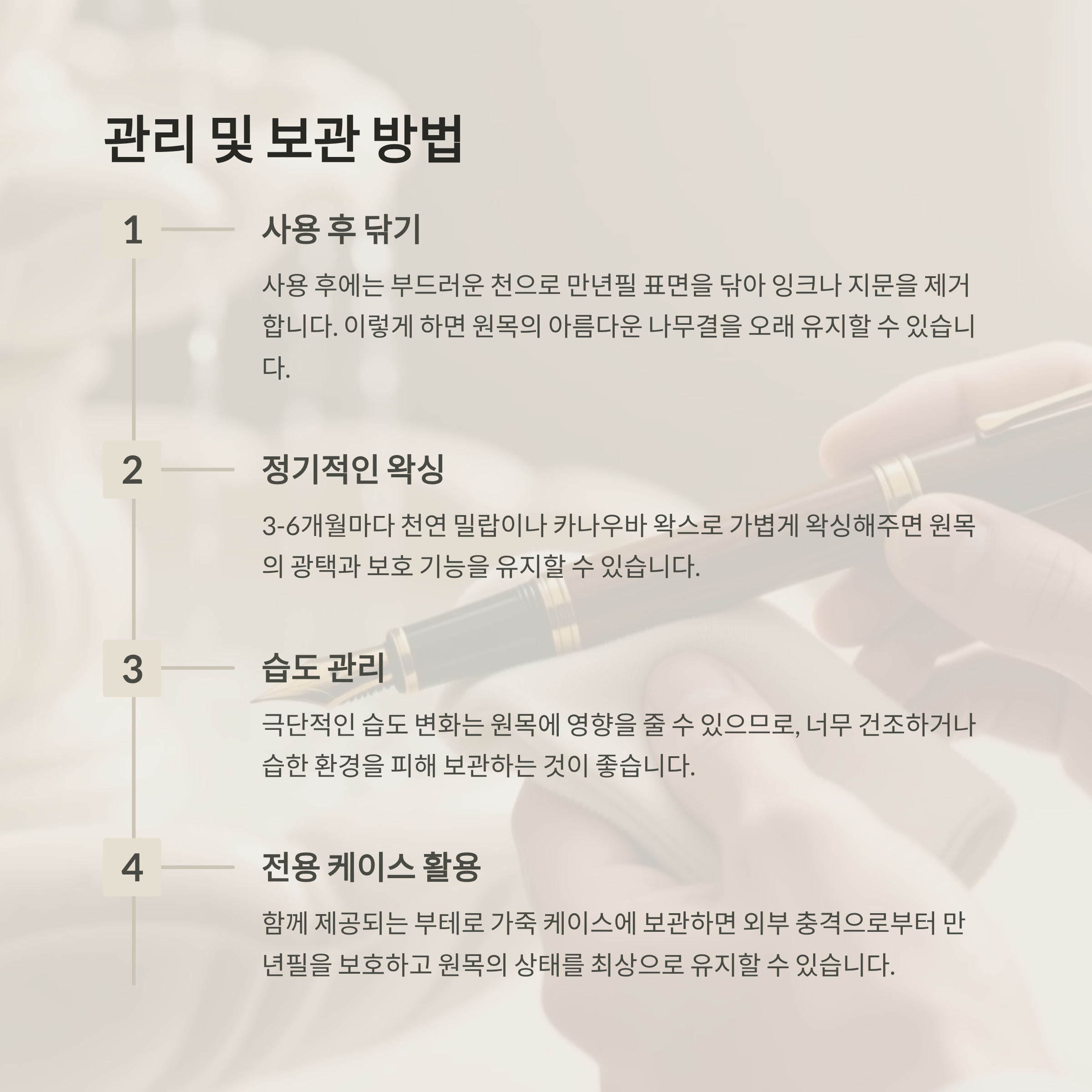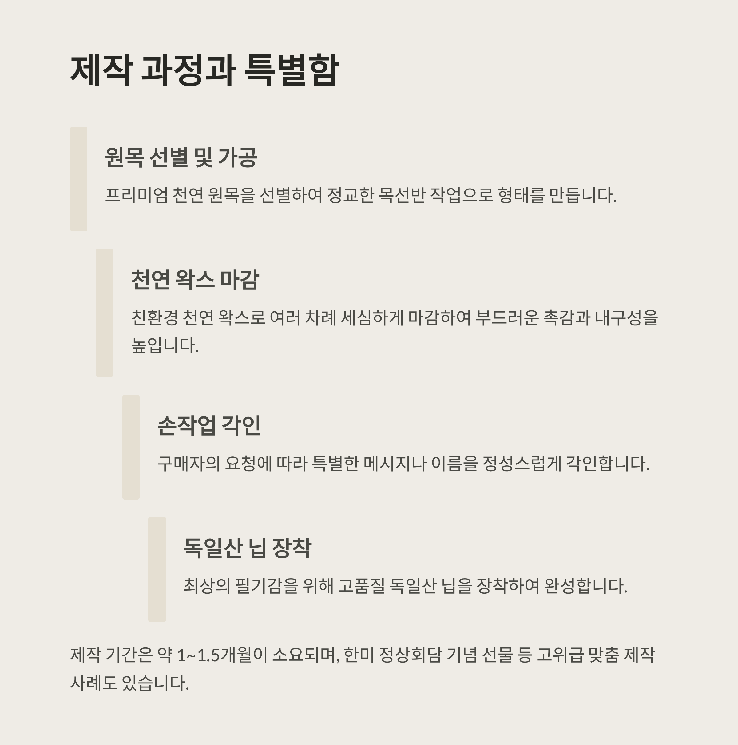 - 공정 과정: 원목 가공 → 천연 왁스 마감 → 손작업 각인 → 독일산 닙 장착