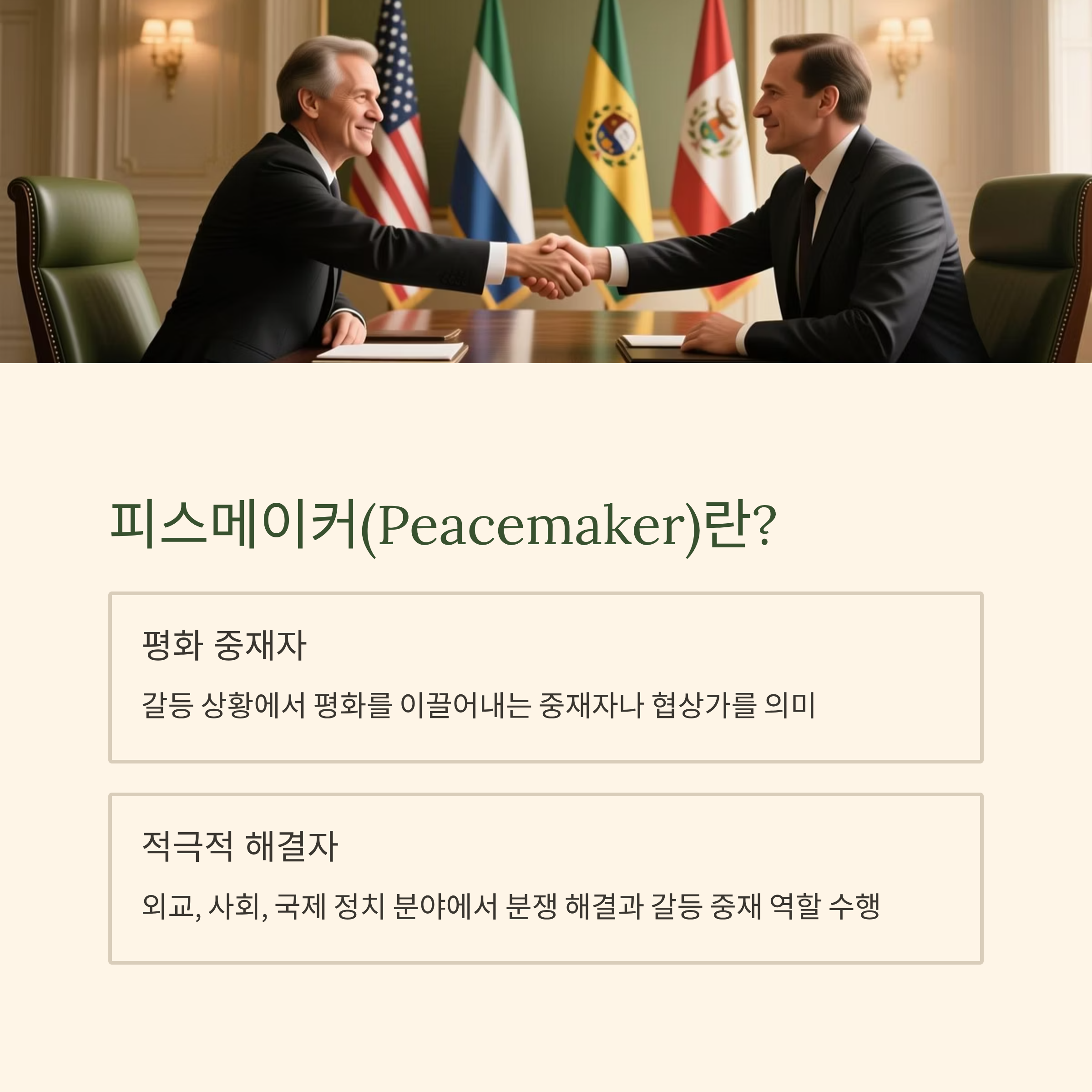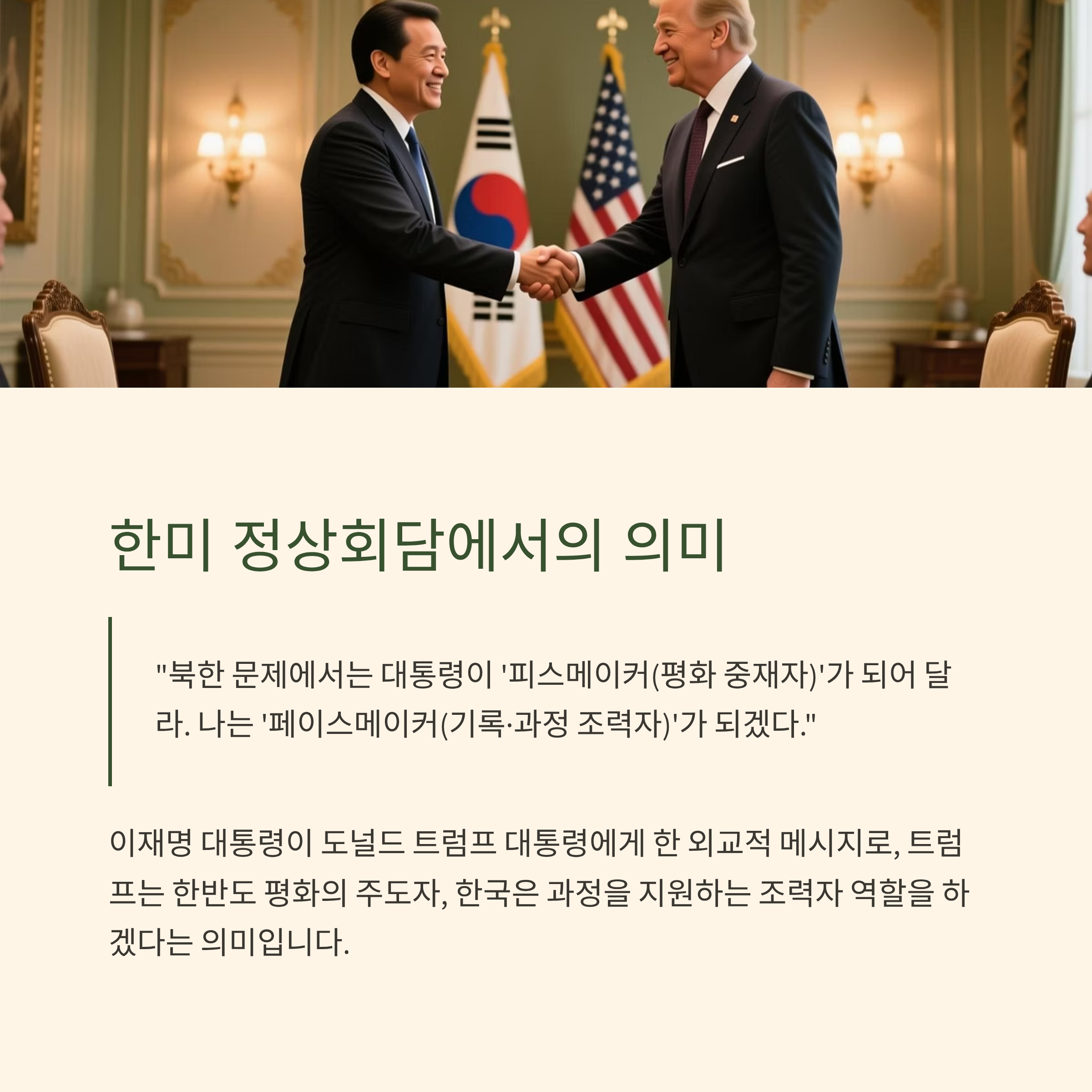 이는 "트럼프 대통령이 한반도 평화의 주도자(피스메이커)"가 되고, 한국은 과정을 지원하는 조력자(페이스메이커) 역할을 하겠다는 외교적 메시지였습니다.