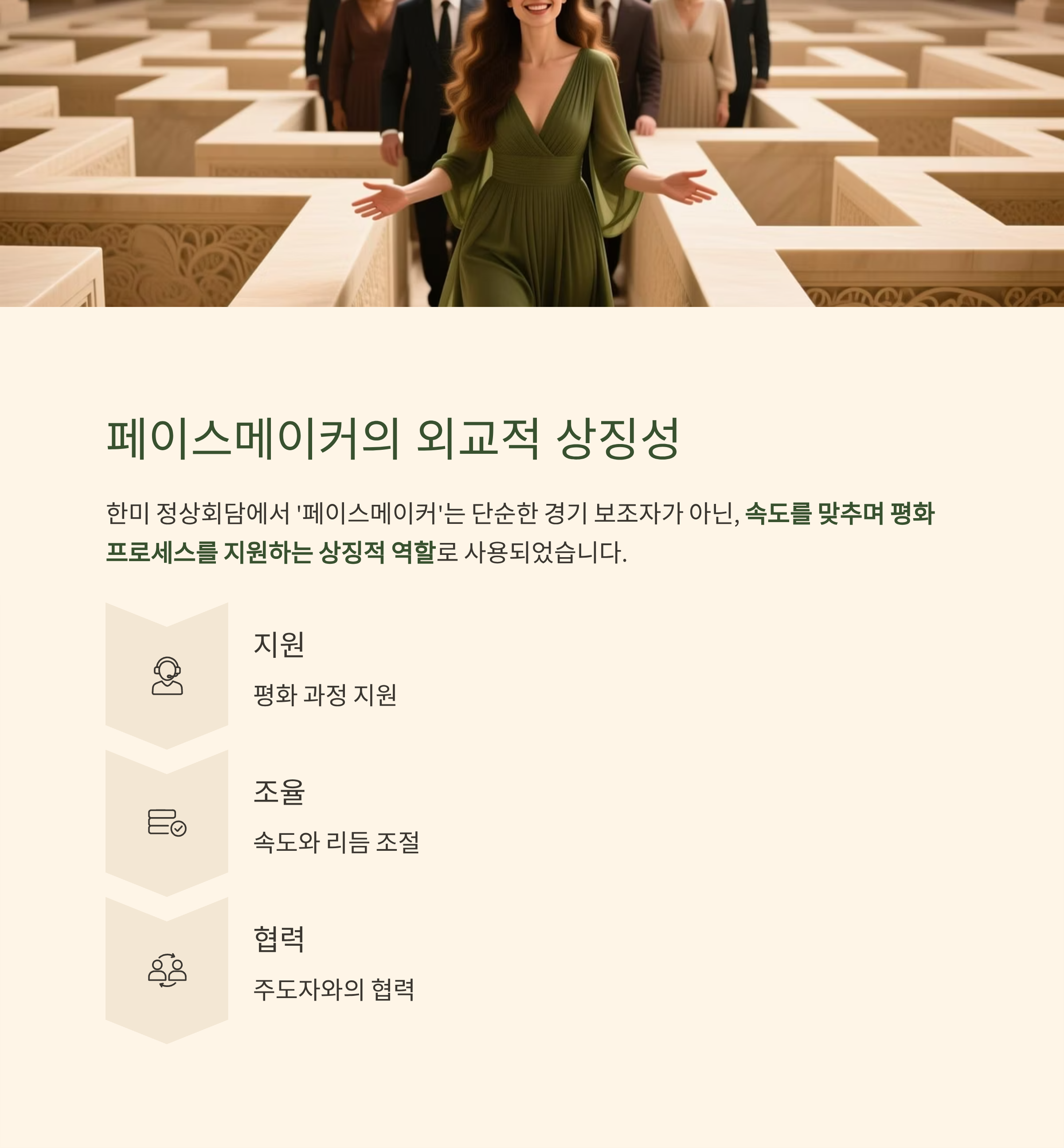 즉, 한미 정상회담에서 ‘페이스메이커’는 단순히 경기 보조자가 아니라, 속도를 맞추며 평화 프로세스를 지원하는 상징적 역할로 사용된 것입니다.