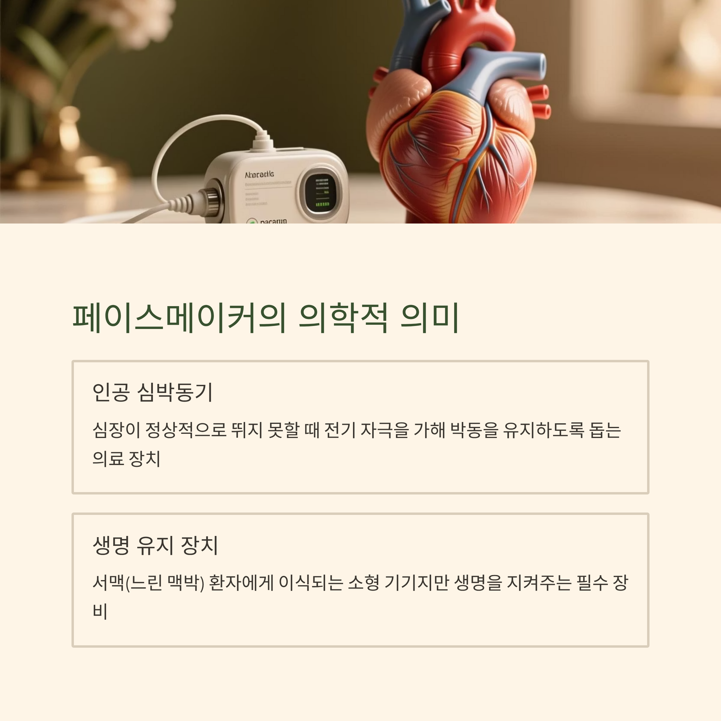 - 심장이 정상적으로 뛰지 못할 때 전기 자극을 가해 박동을 유지하도록 돕는 장치로, 흔히 서맥(느린 맥박) 환자에게 이식됩니다.