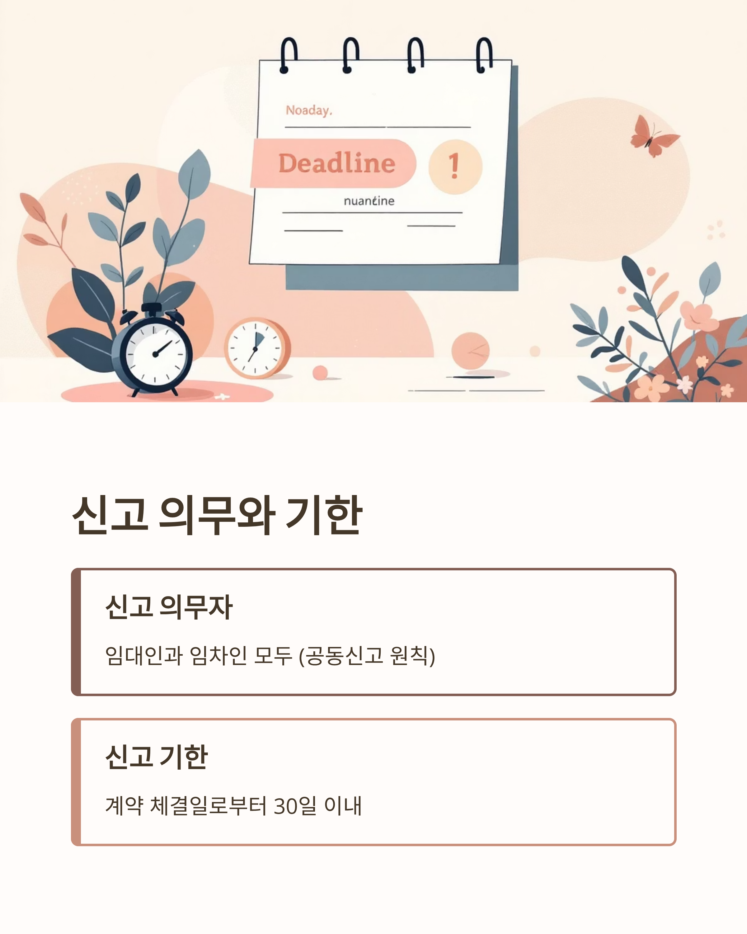 - 신고는 임대차 시장의 투명성을 높이는 동시에 임차인의 권리를 지켜주는 장치이므로 반드시 기간 내에 완료하는 것이 중요합니다.