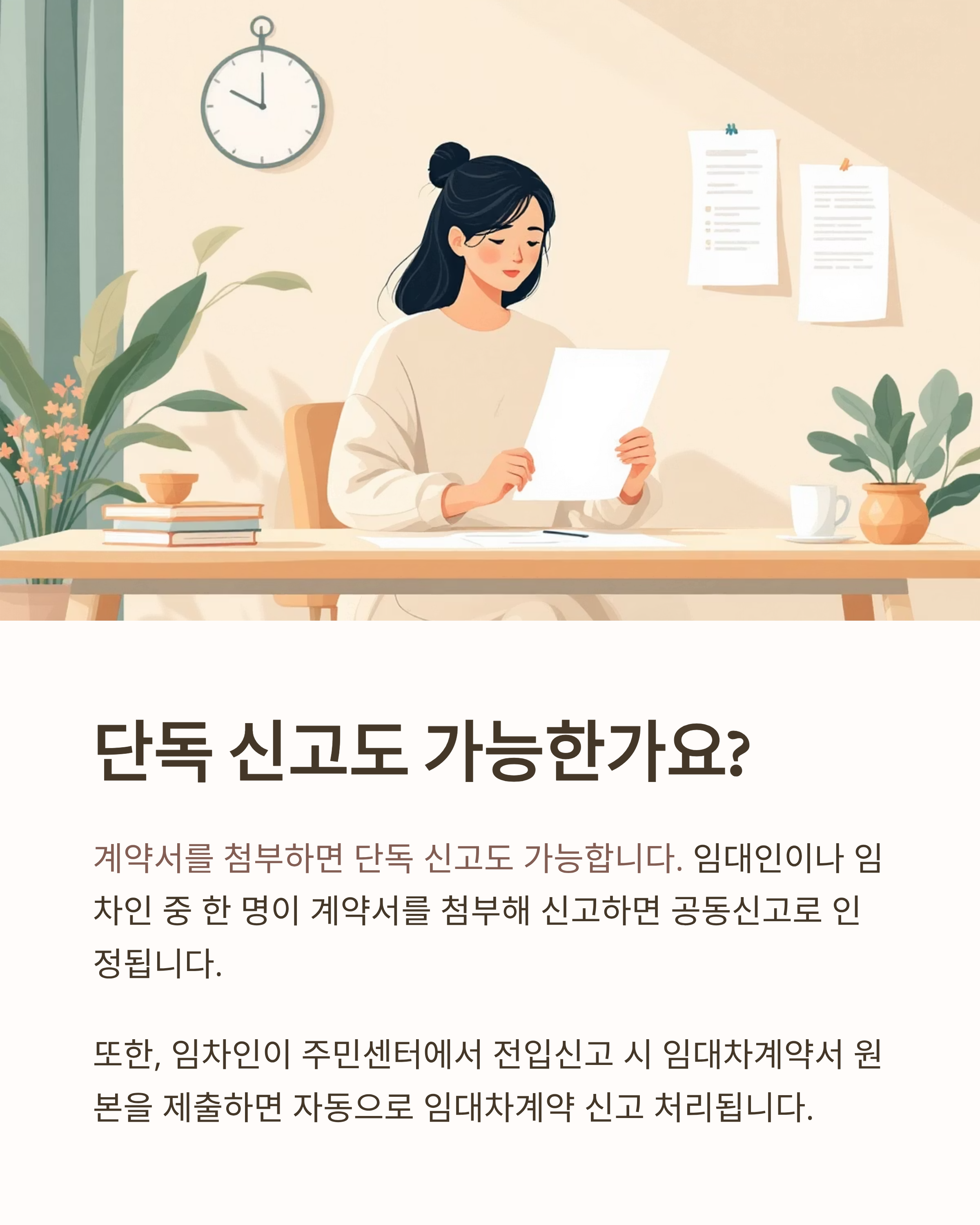 신고는 임대인과 임차인 모두 의무이며, 공동신고가 원칙입니다. 다만, 계약서를 첨부하면 단독 신고도 가능합니다.