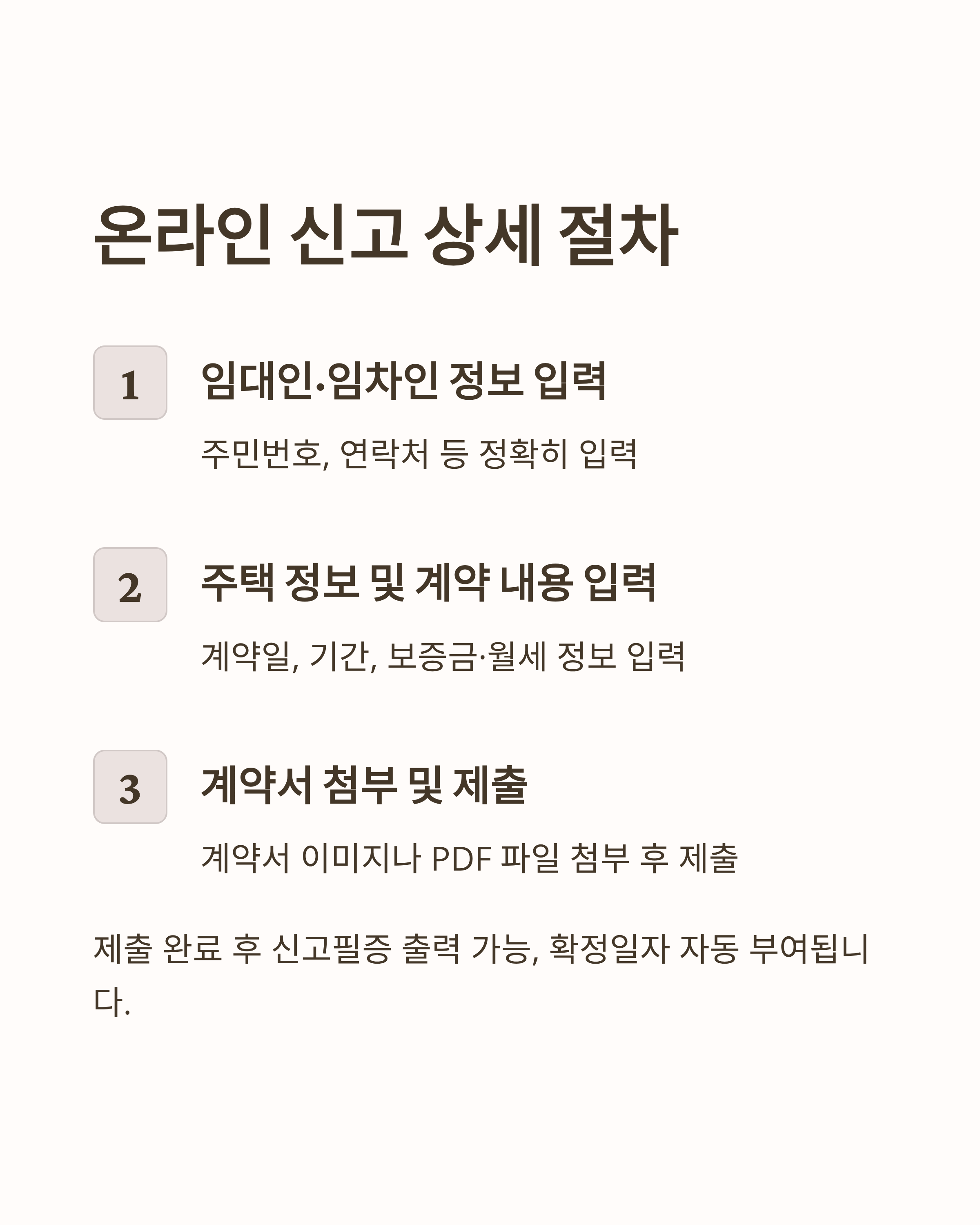- 제출 완료 후 신고필증 출력 가능, 확정일자 자동 부여