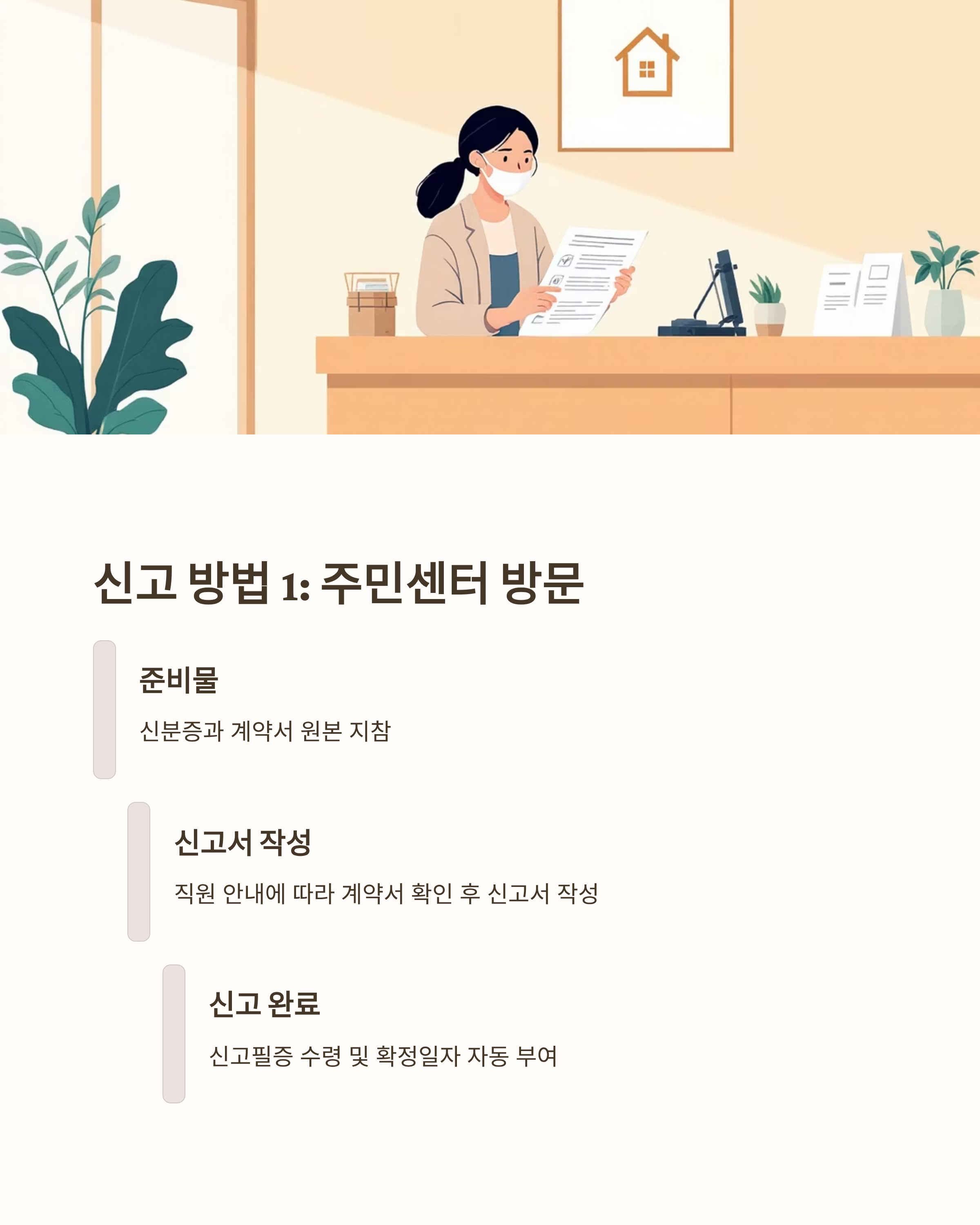 - 주민센터 방문 신고: 신분증과 계약서 원본 지참
