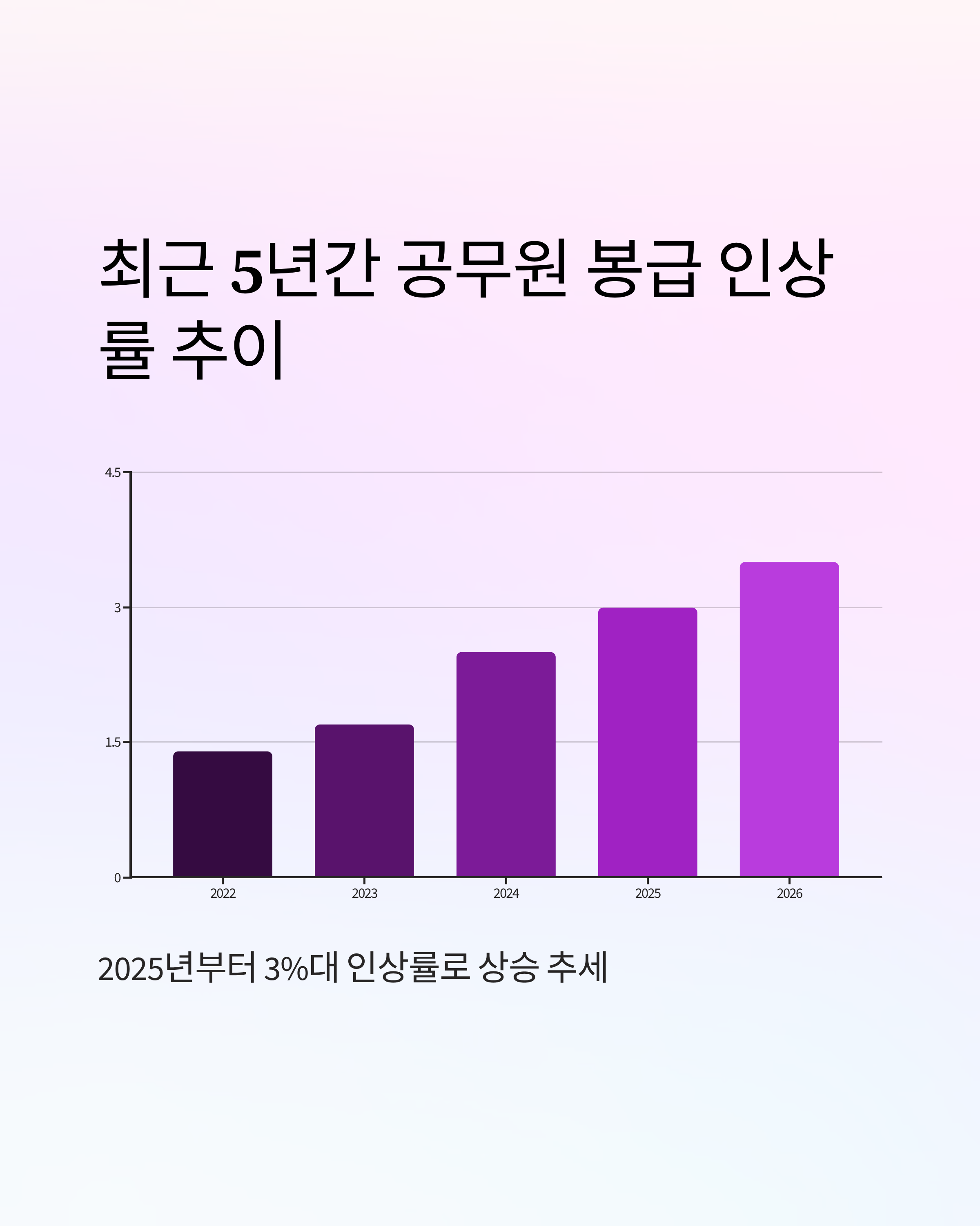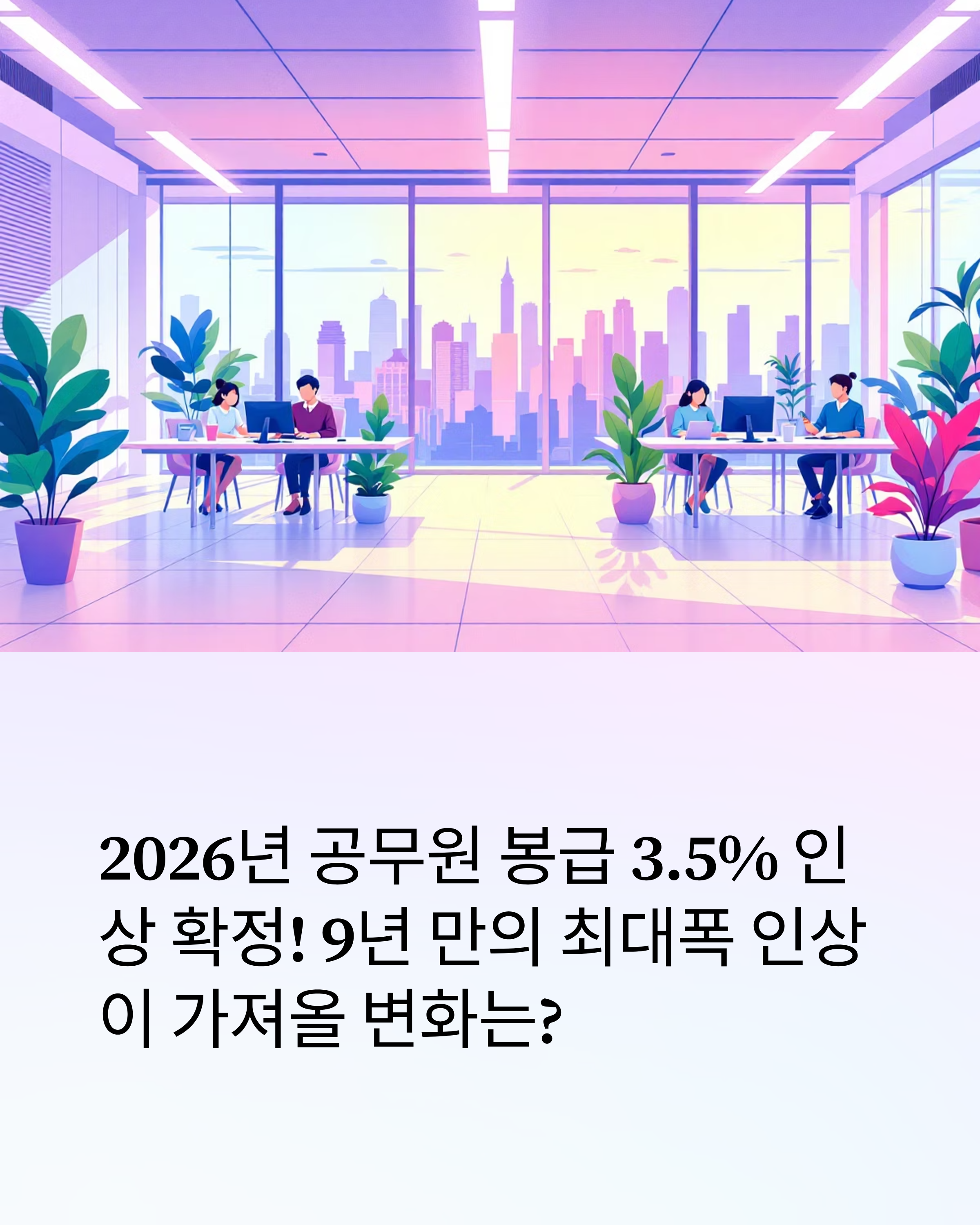 2026년 공무원봉급 인상률은 "3.5%"로 확정되어 2026년 1월부터 적용됩니다. 이는 2017년 이후 9년 만의 최대폭 인상으로, 공무원들의 생활 안정과 공직 사회의 사기 진작에 긍정적인 효과가 기대됩니다.