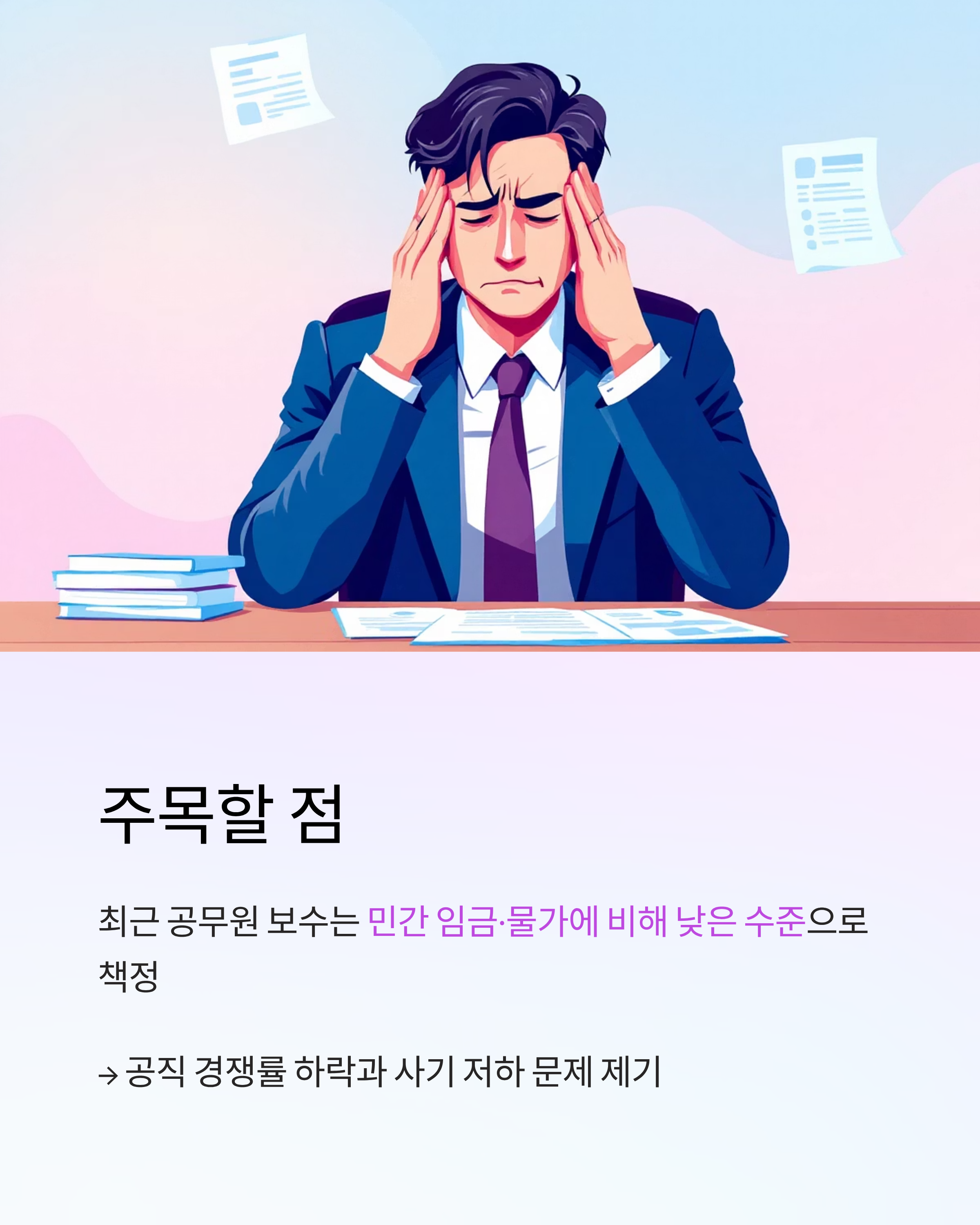 - 최근 공무원 보수는 민간 임금·물가에 비해 낮은 수준으로 책정되어, 공직 경쟁률 하락과 사기 저하 문제가 제기되어 왔습니다.
