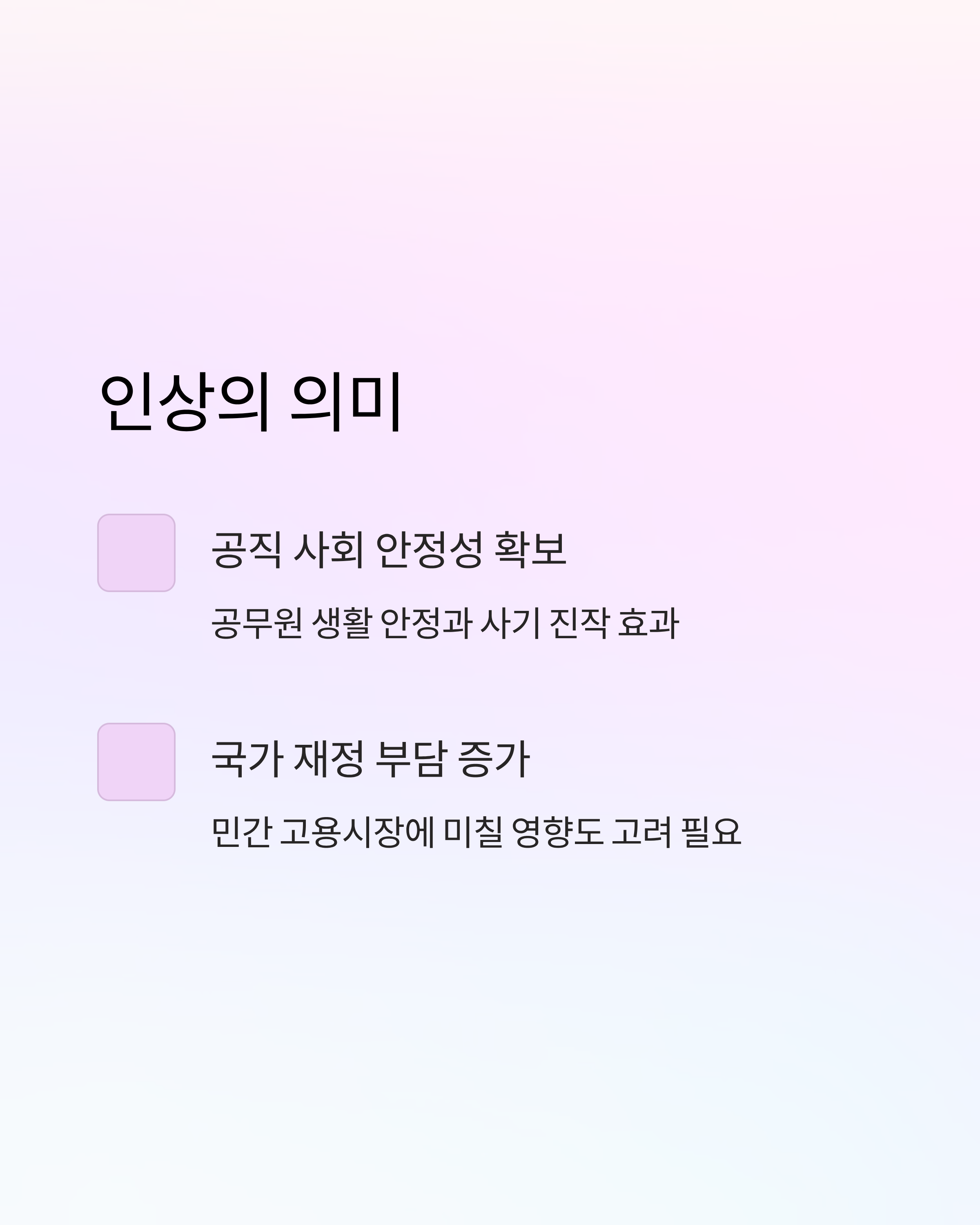 이번 인상은 공무원의 생활 안정과 공직 사회 사기 진작을 위한 조치로 평가됩니다.